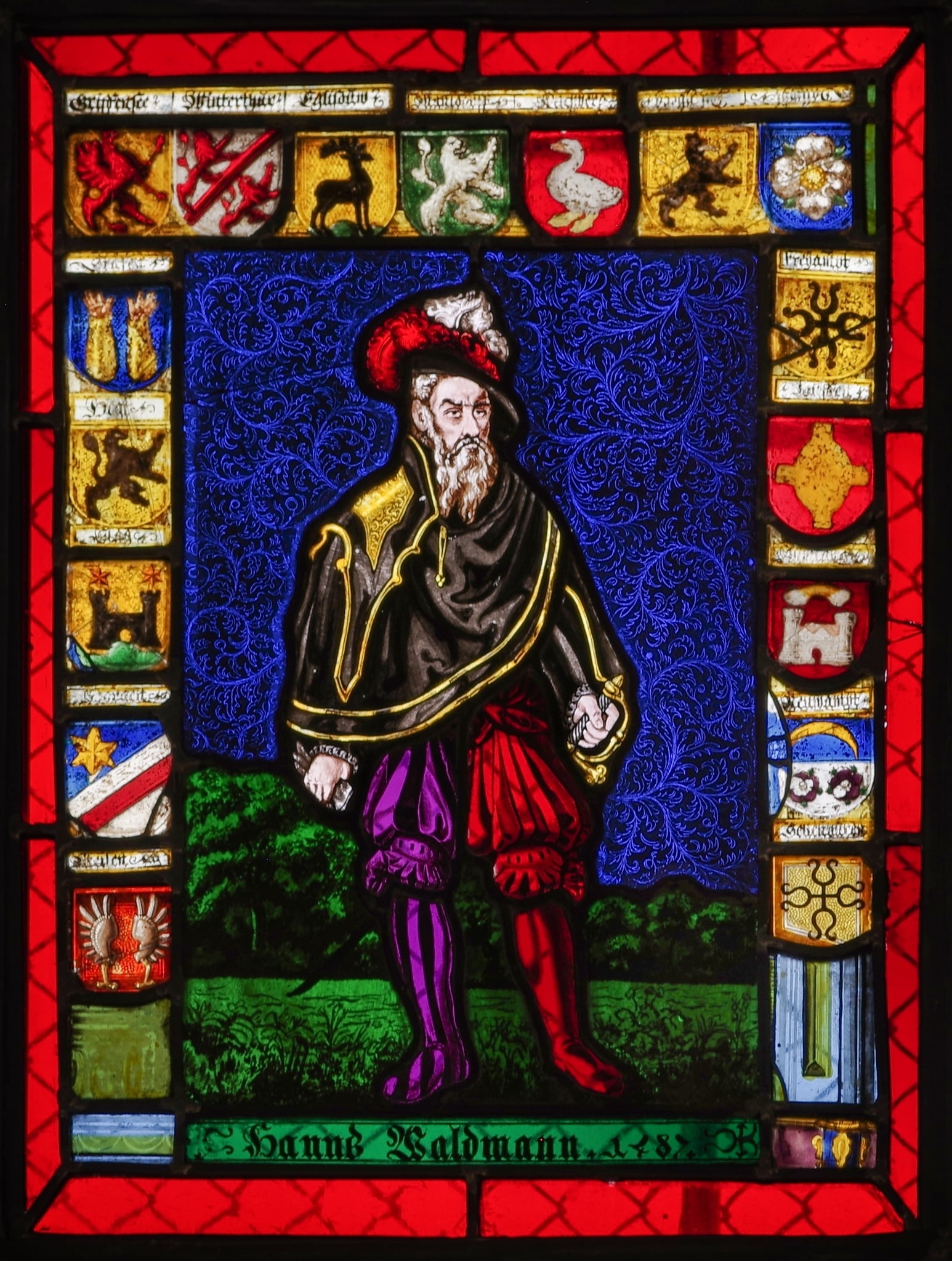 Pour le tambour de la coupole, Müller réalise des copies de vitraux héraldiques datant du XVIe siècle (Deonna, 1938, p. 6 ; Sidler, 1890-1892, p. 7 ; Sidler, 1901, p. 72 ; Sidler, 1905, p. 105) provenant pour la moitié de l’église réformée d’Ursenbach dans le canton de Berne, illustrant des saints, soldats et bannerets. Ce vitrail fait exception. En effet, contrairement aux autres oeuvres, Müller a semble-t-il travaillé sur une base plus ancienne, les armoiries dans l’encadrement, à l’exception des deux situées en bas, provenant probablement d’un vitrail XVIe siècle qu’il a complété et refait.