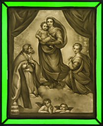 Le premier au centre est une copie d’un tableau de la Renaissance, La Madonne Sixtine, dite Madone de Dresde, de Raphaël. La Vierge à l’Enfant en pied au centre est encadrée par saint Sixte et sainte Barbe alors qu’au premier plan en bas deux putti sont accoudés.