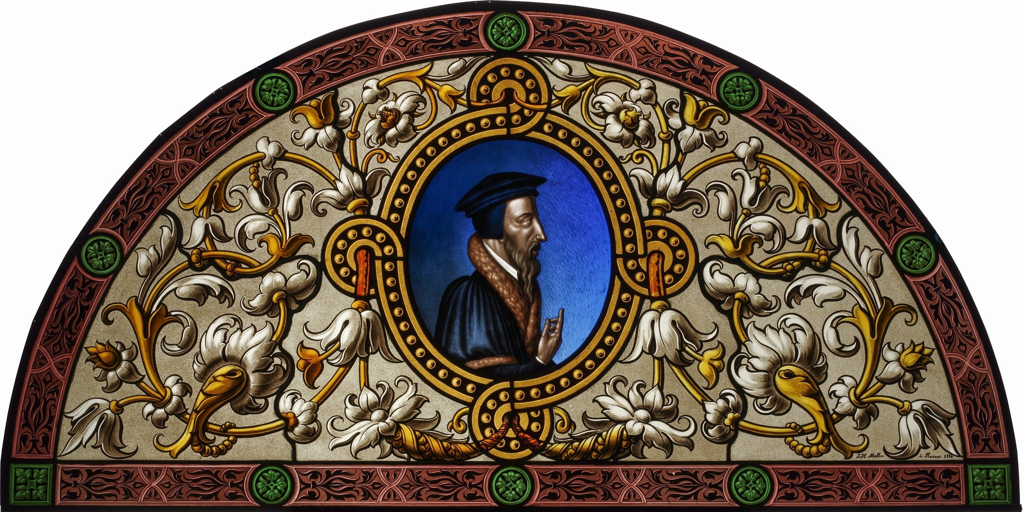 Ce vitrail ainsi que cinq autres présentant des portraits de réformateurs ont été réalisés en 1886, comme le mentionne la date présente sur cette verrière en bas à droite de la baie. Ils sont l’oeuvre du peintre verrier bernois Johann Heinrich Müller et font partie d’un groupe de vingt-six vitraux commandées en 1883 par Gustave Revilliod et réalisées entre 1883 et 1886 pour les ouvertures du tambour de la coupole, les dormants des deux portes d’entrée et les fenêtres du rez-de-chaussée du Musée Ariana (Deonna 1938, p. 2). Alors que les vitraux du tambour de la coupole et des dormants des portes d’entrée sont encore aujourd’hui en place, ces six portraits ont été déposés à une date indéterminée à la suite de diverses interventions au musée. Ils s’inscrivent sur un fond ornemental composé de volutes ornées d’éléments végétaux et floraux s’inspirant stylistiquement de la Renaissance italienne. Müller fait un travail de peinture à la grisaille et au jaune d’argent délicat et précis, qui démontre ses qualités de peintre qui s’expriment pleinement sur les portraits.
