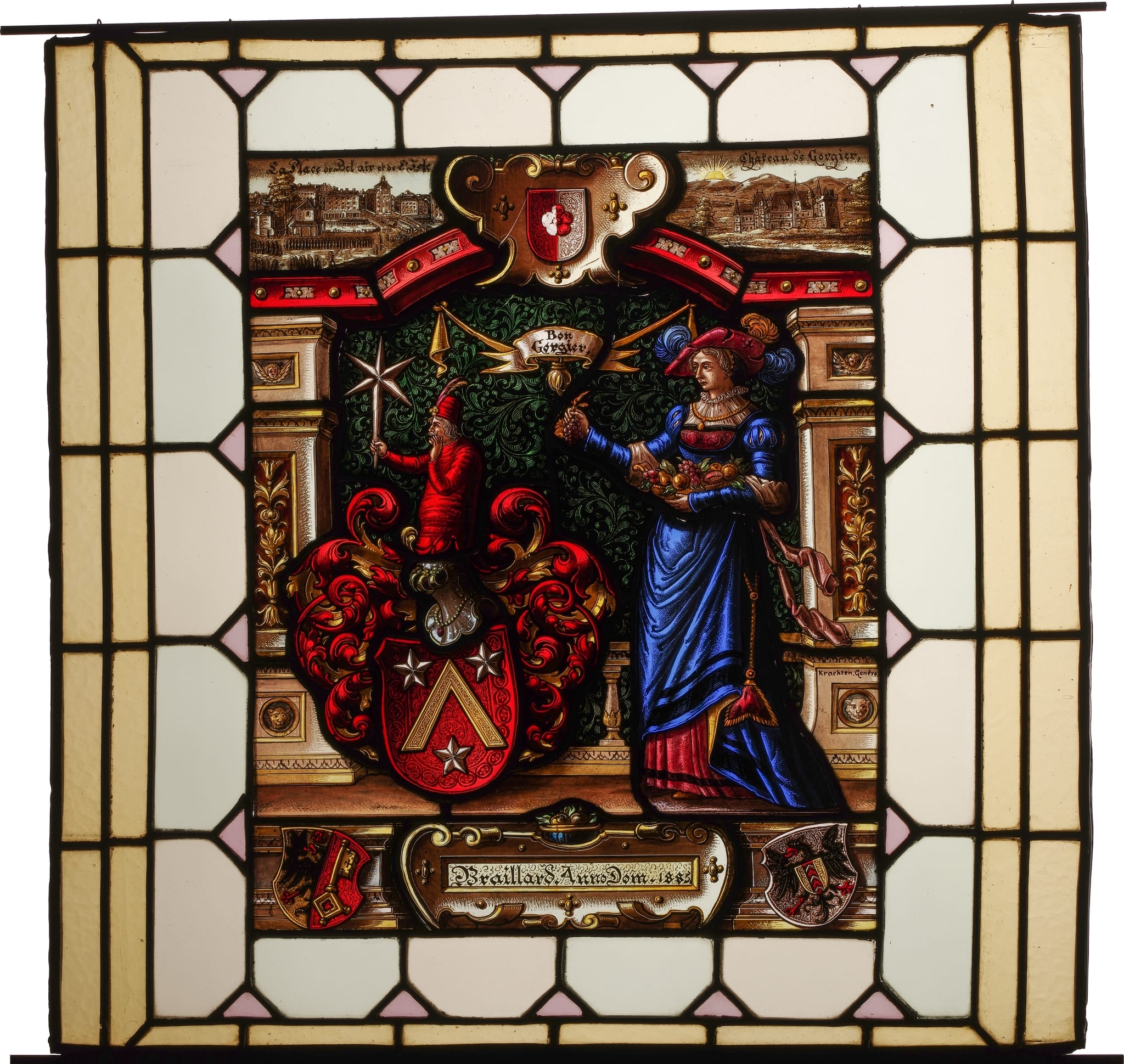 Ce vitrail héraldique aux armes de la famille Braillard et son pendant aux armes de la famille Raisin (GE_2249) sont l’oeuvre de l’atelier genevois Gérard Krachten, réalisés en 1885 pour le mariage d’Henriette-Stéphanie Braillard (1860-1943) et Frédéric Raisin (1851-1923). Ils sont une donation de Liliane Raisin-Grandjean au Musée Ariana en 2018.