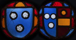 Fentes à gauche, grisaille presque entièrement disparue (aucune trace sur l’écu droite), traces de corrosion, griffures du verre liées au nettoyage de la corrosion, mise en plomb moderne.