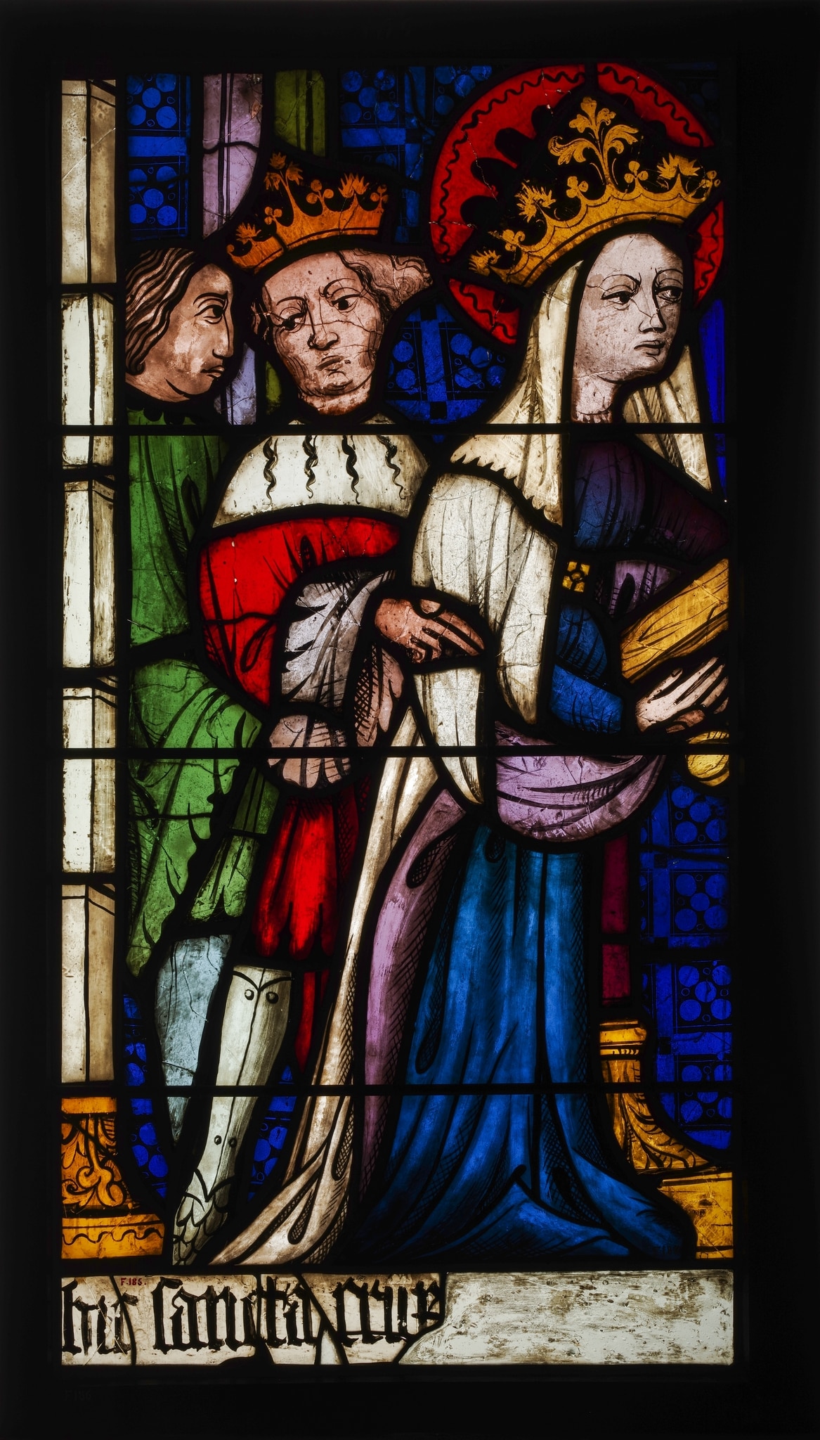 Ce vitrail et son pendant (GE_2256) sont issus de la baie sud du choeur de l’église Mariä Himmelfahrt d’Eriskirch, en Allemagne. Cette fenêtre, découpée en sept niveaux, est dédiée à la légende de la découverte de la Vraie Croix par sainte Hélène, mère de l’empereur Constantin. Dans un encadrement architectural, trois scènes superposées représentent de haut en bas les principaux épisodes de la légende. Envoyée à Jérusalem après la miraculeuse victoire militaire de son fils, Hélène s’adresse aux Juifs afin de retrouver la croix sur laquelle le Christ a été crucifié. Elle est emmenée au Golgotha où les trois croix du Christ et des larrons lui sont présentées. Afin de définir laquelle est celle du Christ, elles sont tour à tour imposées sur une dépouille afin de révéler leur caractère miraculeux : la morte ressuscite alors, suite à son exposition à la Vraie Croix. Ce dernier épisode, aujourd’hui conservé à l’Ariana, était à l’origine situé dans la partie basse de la baie. Il était couronné d’une architecture composée d’arches en plein cintre et de balustrades avec des anges.