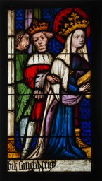 Une seconde verrière consacrée aux donateurs et aux saints, anciennement insérée dans la baie d’axe, se trouve aujourd’hui dans la fenêtre nord. Bien que ces vitraux aient été remaniés au début du XIXe siècle suite à l’installation d’un retable baroque dans le choeur (Gast & Scholz, 2023), ils présentent aujourd’hui encore des liens formels, tels que leur composition architecturale similaire (Becksmann, 1986, p. 46). Les vitraux d’origine de la baie nord, représentant des saints, ont été dispersés lors de leur mise en vente sur le marché de l’art de Munich au XIXe siècle (cf. Becksmann, 1968, p. 43 et suivantes ; Gast & Scholz, 2023).