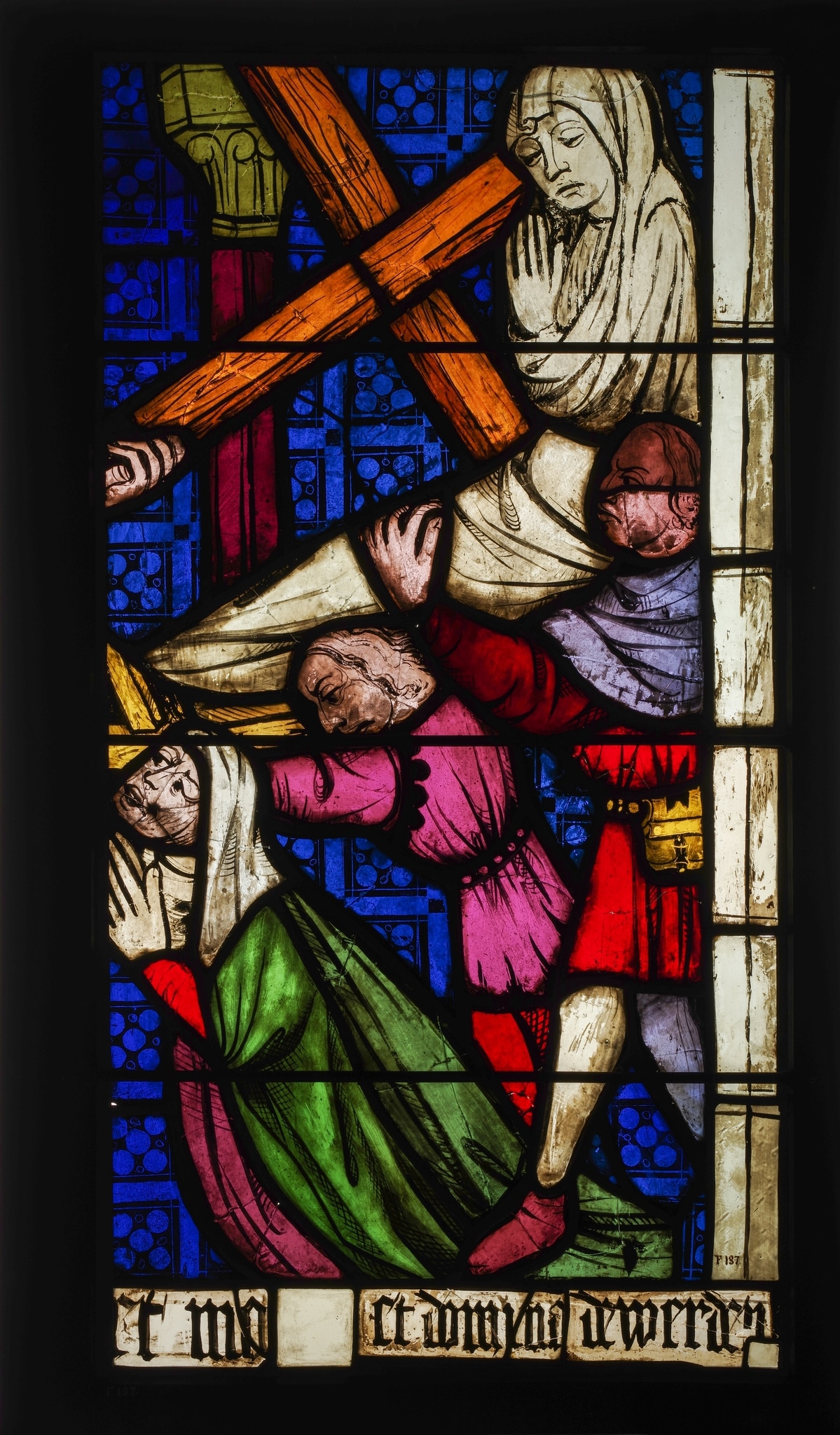 La bordure inférieure des deux vitraux présente une inscription fragmentaire, dont les parties perdues ont été complétées à l’aide de pièces de remploi provenant de l’ancienne fenêtre d’axe (Becksmann, 1986, p. 55). Le texte fragmentaire “hic sancta crux [...] / [...]ct mo[...] et domina de werden[berg]” a été remanié et complété sur la copie en “hic sancta crux imponitur / et mortuus in vitam reediit”, que l’on peut traduire par “ici, la croix est posée et le mort est revenu à la vie”.