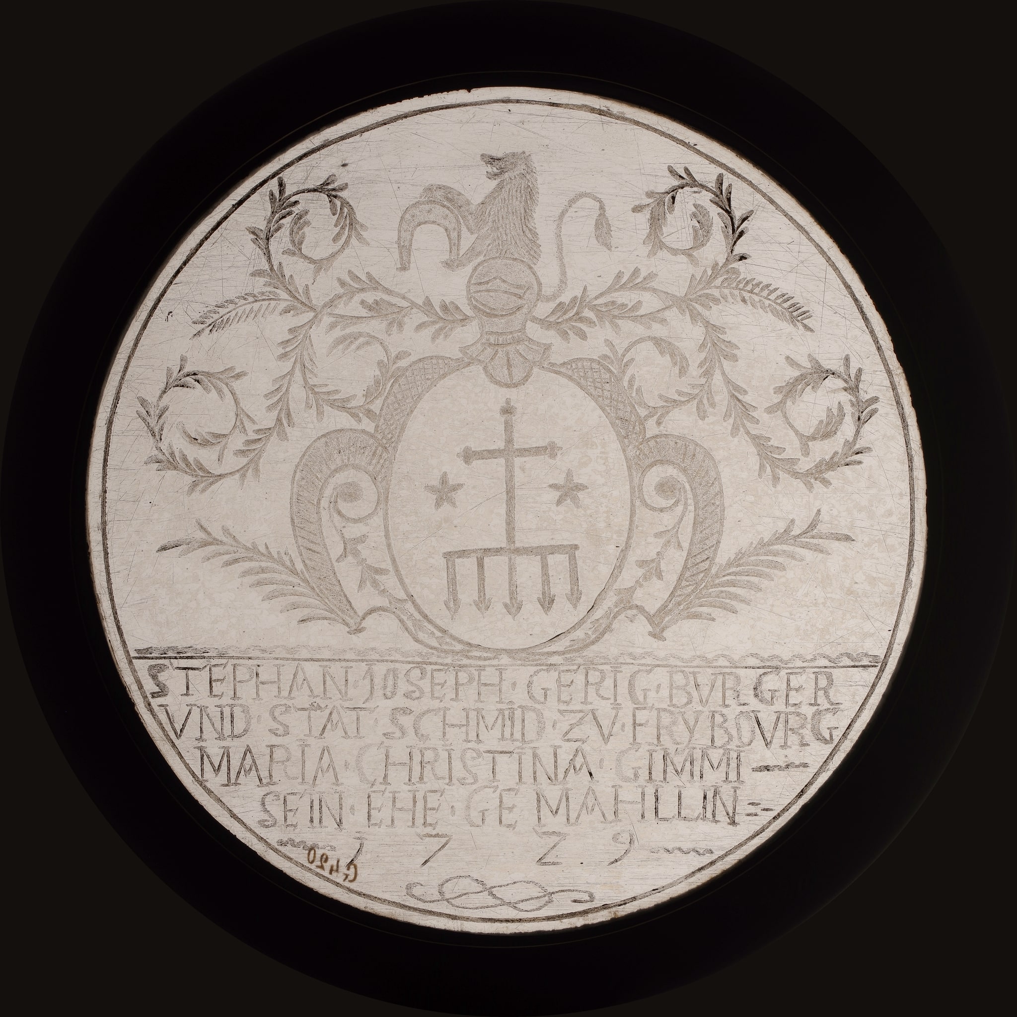 Le médaillon a été donné en 1729 par le couple Maria Christina Gimmi et Stephan Joseph Gerig, alors que celui-ci était citoyen et forgeron de Fribourg. A ce jour, nous ne possédons pas plus d’informations sur les donateurs. Les commanditaires de ce type de panneau sont originaires de divers milieux sociaux et professionnels. La coutume a dans un premier temps été introduite par les familles aisées, puis s’est étendue aux agriculteurs, artisans, négociants, enseignants, chirurgiens, etc. Les familles paysannes ne possédant souvent pas d’armoiries, elles se sont alors créé des armes évoquant leur fonction, soit de toute pièce, soit en lien avec leur nom, ce qui explique les nombreux écus armoriés qui ne correspondent pas toujours à ceux connus (Paravicini-Stähelin, 1926, p. XVII-XVIII).