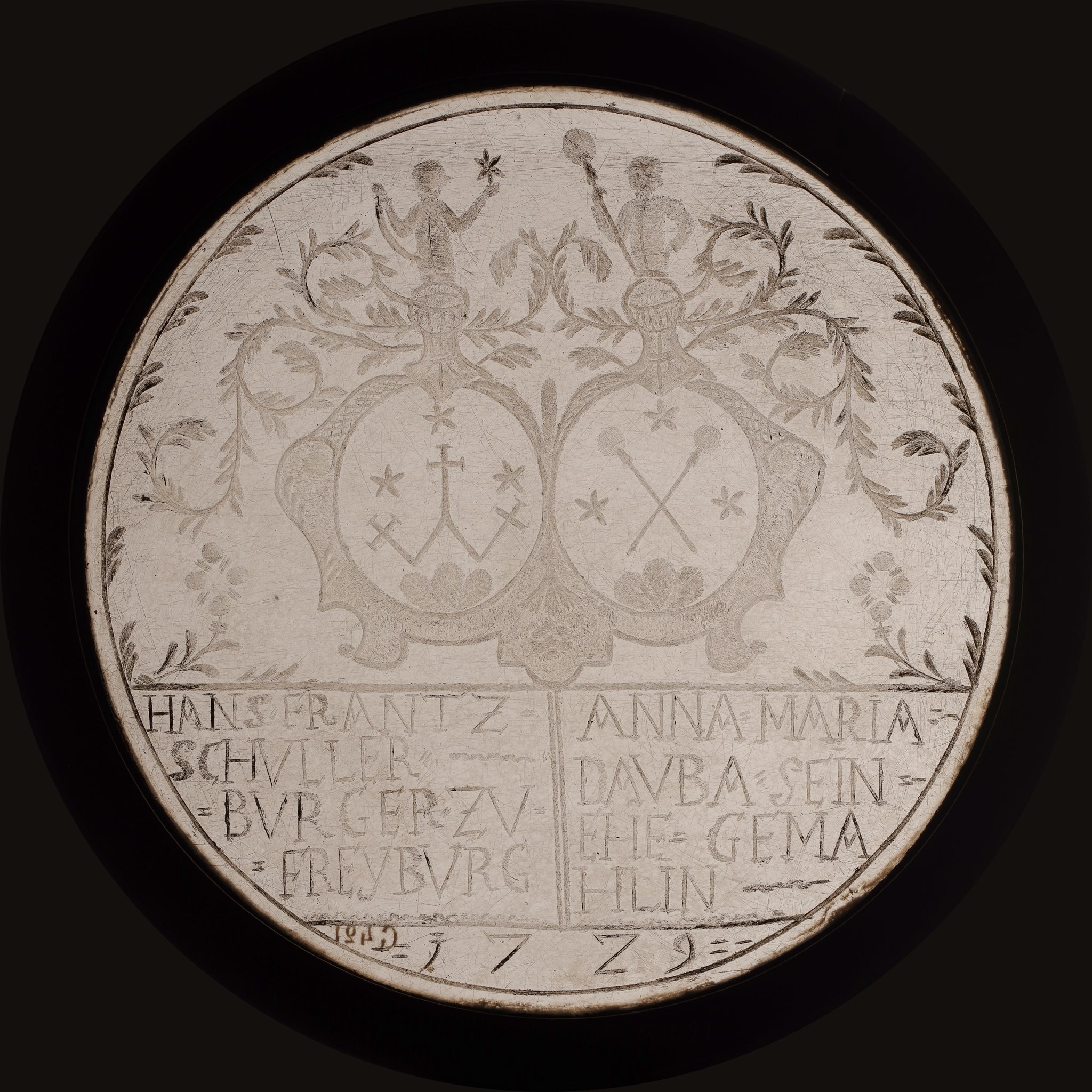 Le médaillon a été donné en 1729 par le couple Anna Maria Dauba et Hans Franz Schuler, citoyens de Fribourg. A ce jour, nous ne possédons pas plus d’informations sur les donateurs. Les commanditaires de ce type de panneau sont originaires de divers milieux sociaux et professionnels. La coutume a dans un premier temps été introduite par les familles aisées, puis s’est étendue aux agriculteurs, artisans, négociants, enseignants, chirurgiens, etc. Les familles paysannes ne possédant souvent pas d’armoiries, elles se sont alors créé des armes évoquant leur fonction, soit de toute pièce, soit en lien avec leur nom, ce qui explique les nombreux écus armoriés qui ne correspondent pas toujours à ceux connus (Paravicini-Stähelin, 1926, p. XVII-XVIII).