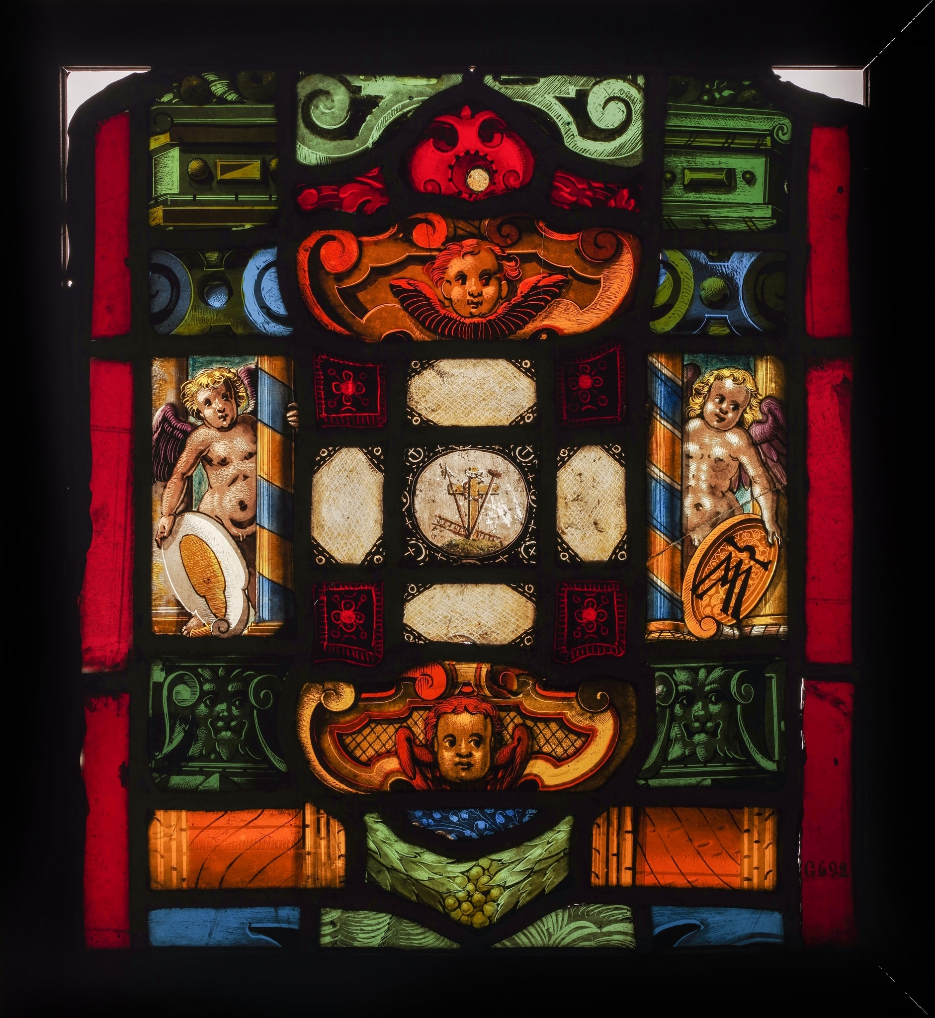 Ce panneau composite est constitué de nombreux fragments qui proviennent probablement de vitraux de provenance et d'époque diverses. Représentés au centre de la composition, les instruments de la Passion ont souvent été figurés pour rappeler la victoire du Christ sur le mal et son rachat de l'humanité. Tout d'abord utilisés comme des emblèmes de triomphe et de souveraineté, ils deviennent dès le début du XIVe siècle des motifs de dévotion et de vénération de la Passion du Christ, comme chez Bernard de Clairvaux (1091-153) et François d'Assise (1182-1226) (Hoegger, 2002, p. 280). Jusqu'à la fin du XVIIe siècle, la représentation des Arma Christi invitait les croyants à la méditation et leur permettait de se remémorer les différentes étapes de la Passion (Berliner, 1955, p. 95). Ce motif occupe le fond d'un vitrail armorié commandé par l'ecclésiastique Christoph von Ägeri (†1630) à un atelier de peintre verrier de Zoug (peut-être celui de Paul Müller ?) en 1626 (Hoegger, 2002, p. 280-281). Il n'était pas rare que ces armes apparaissent également comme charge héraldique, par exemple sur le vitrail daté vers 1630 (FR_114) attribué au peintre verrier fribourgeois Johann Wäber (1602-1640) qui se trouve au Musée d'art et d'histoire de Fribourg, sur le fragment armorié conservé au Musée Grobet-Labadié à Marseille (cf. Bergmann, 2014, p. 603, fig. 114.2) ou encore sur le carton réalisé en 1594 par le maître schaffhousois Daniel Lindtmayer (1552-1603) (cf. Bergmann, 2014, p. 603, fig. 114.1), probablement pour une confrérie des morts ou des âmes (Thöne, 1975, p. 211). Bien que le présent fragment ne semble pas avoir orné un écu, il provient probablement d'un vitrail commandé par un membre de l'église ou une confrérie qui vénérait la Passion du Christ.