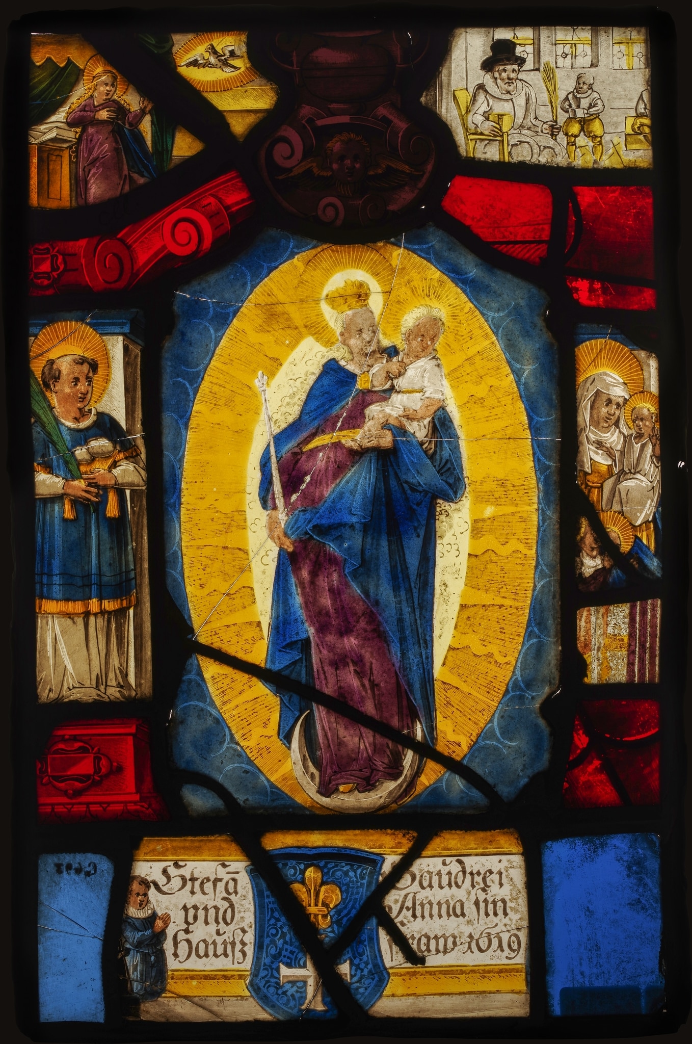 Ce panneau a été restauré à l’aide de plusieurs pièces de remploi de provenance et d’époque diverses (écoinçon droit et partie des éléments architecturaux). Il a été commandé par Stefan et Anna Baudrei (Boudry ?). Les saints Étienne et Anne présents sur les côtés apparaissent tous deux comme les patrons des donateurs. Le personnage masculin agenouillé à gauche de l'inscription figure le commanditaire. Il est probable que son épouse ait également été représentée de l'autre côté, à droite du cartouche. A ce jour, nous ne possédons pas plus d’informations sur le couple.