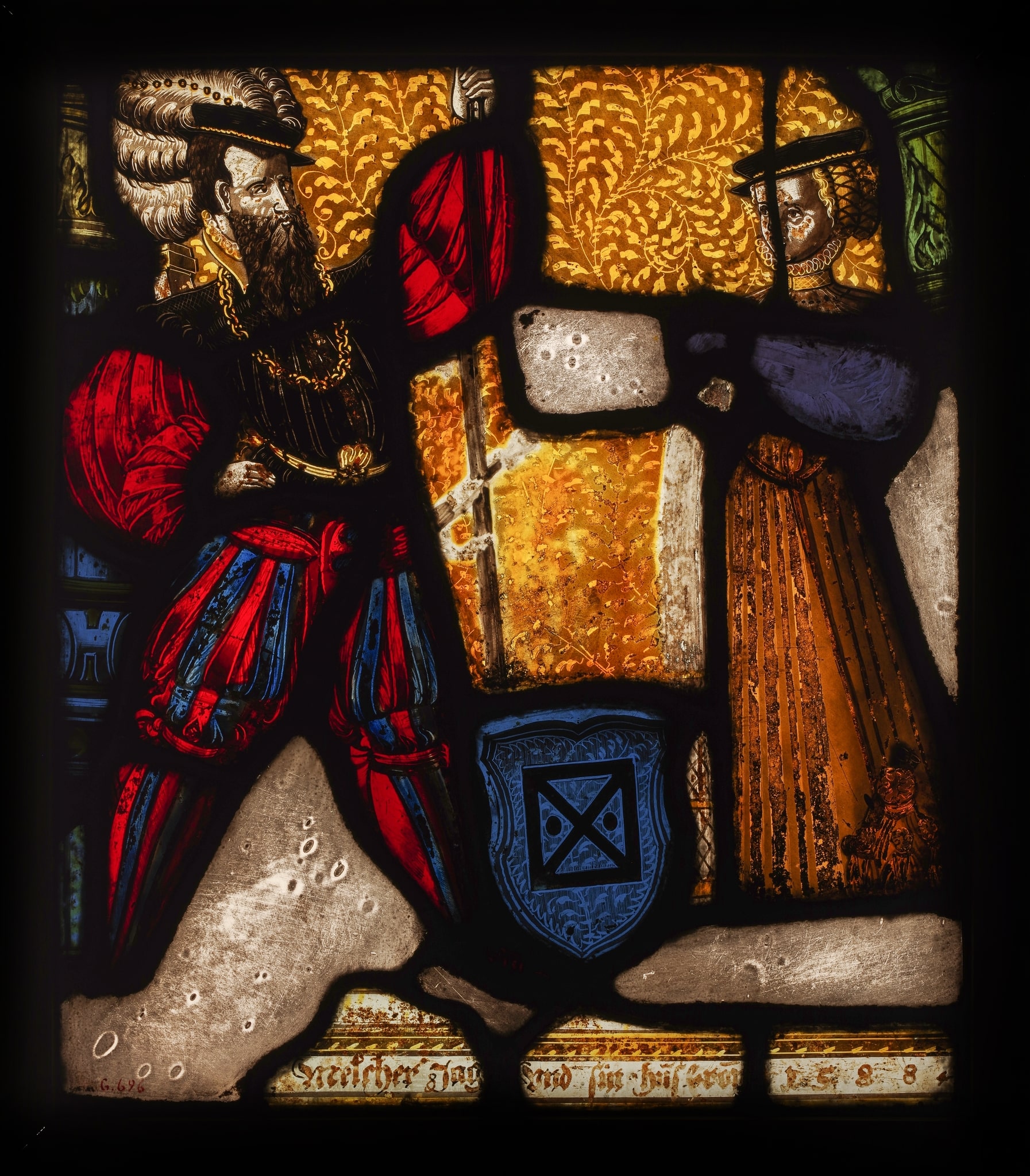 Ce vitrail de bienvenue a été fortement endommagé (perte de la grisaille et des bordures) et restauré (plombs de casse et pièces de remploi disparates), ce qui rend sa lecture difficile. Le nom de Melchior Jag[...] étant coupé par un plomb et les armoiries inconnues étant un complément, il n'est à ce jour pas possible d'identifier le couple de commanditaires. En l’absence de la partie supérieure du panneau qui figurait probablement des scènes relatives à l’activité professionnelle des donateurs, leur métier demeure également indéterminé.