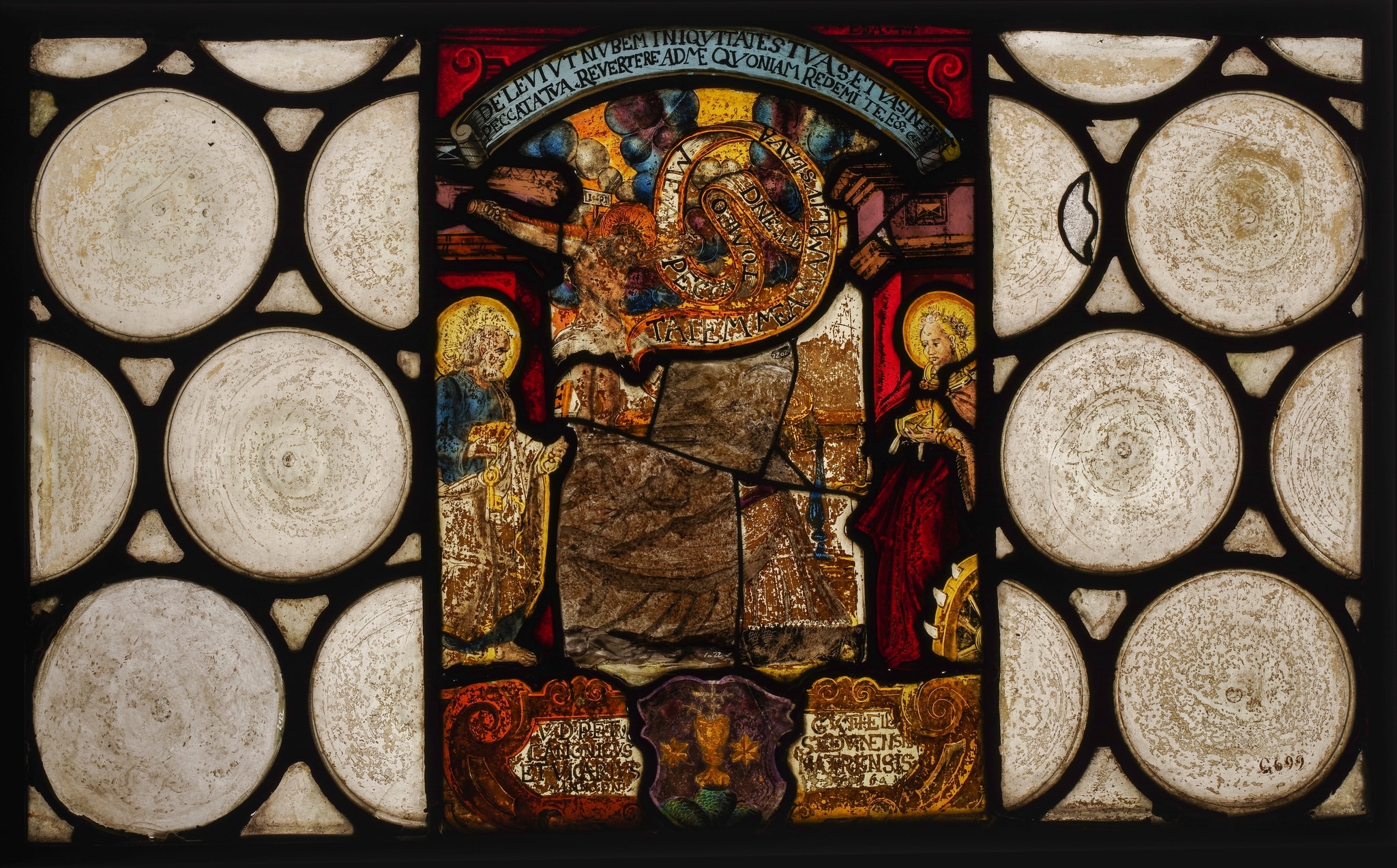Vitrail rectangulaire inséré dans une fenêtre à cives, représentant au centre le Christ crucifié sur un fond de nuées, accompagné d’un phylactère comportant une inscription latine. Le mauvais état de la partie basse ne permet pas d’identifier le reste de la représentation. La scène s’inscrit dans un cadre architectural composé de deux colonnes soutenant une arche sur laquelle est inscrite une citation biblique tirée d’Esaïe 44. Devant les colonnes figurent à gauche saint Pierre et à droite sainte Catherine, en possession de leurs attributs. Dans la partie inférieure figure un écu armorié au centre d’un entablement architectural accompagné de part et d’autre d’une inscription du donateur.