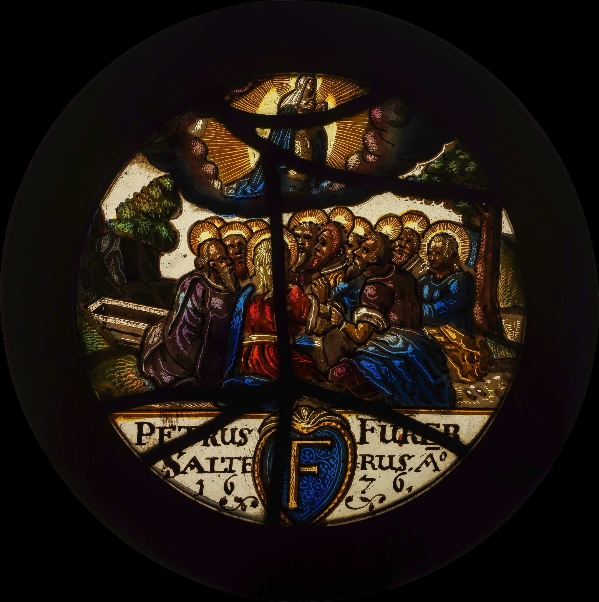 Médaillon monolithe circulaire représentant l’Assomption de la Vierge Marie. Au centre, les apôtres sont accroupis autour de la tombe vide de la Vierge qui s’élève dans le ciel dans une nuée. Dans la partie inférieure figure une inscription du donateur de part et d’autre d’un écu monogrammé.