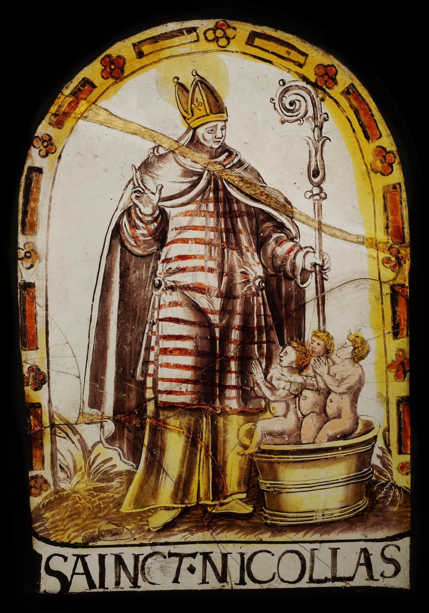 Ce vitrail représente saint Nicolas après qu’il ait ressuscité les trois jeunes enfants dans le saloir, d’après l’un des épisodes traditionnellement attribué à la vie du saint. Le peintre verrier n’est pas identifié. Au XVIIe siècle, les médaillons monolithes ovales figurant des saints ou des scènes bibliques sont particulièrement répandus dans les Pays-Bas (cf. Berserik & Caen, 2011, vol. 2, p. 52-53) ou dans le sud de l’Allemagne (cf. Husband, 1991, p. 83). Compte tenu du style, de la technique et du format, l’ensemble des vitraux (GE_2293 à GE_2297) acheté en 1892 à A. Bussien (fils) au Bouveret en Valais semble provenir de ces régions.