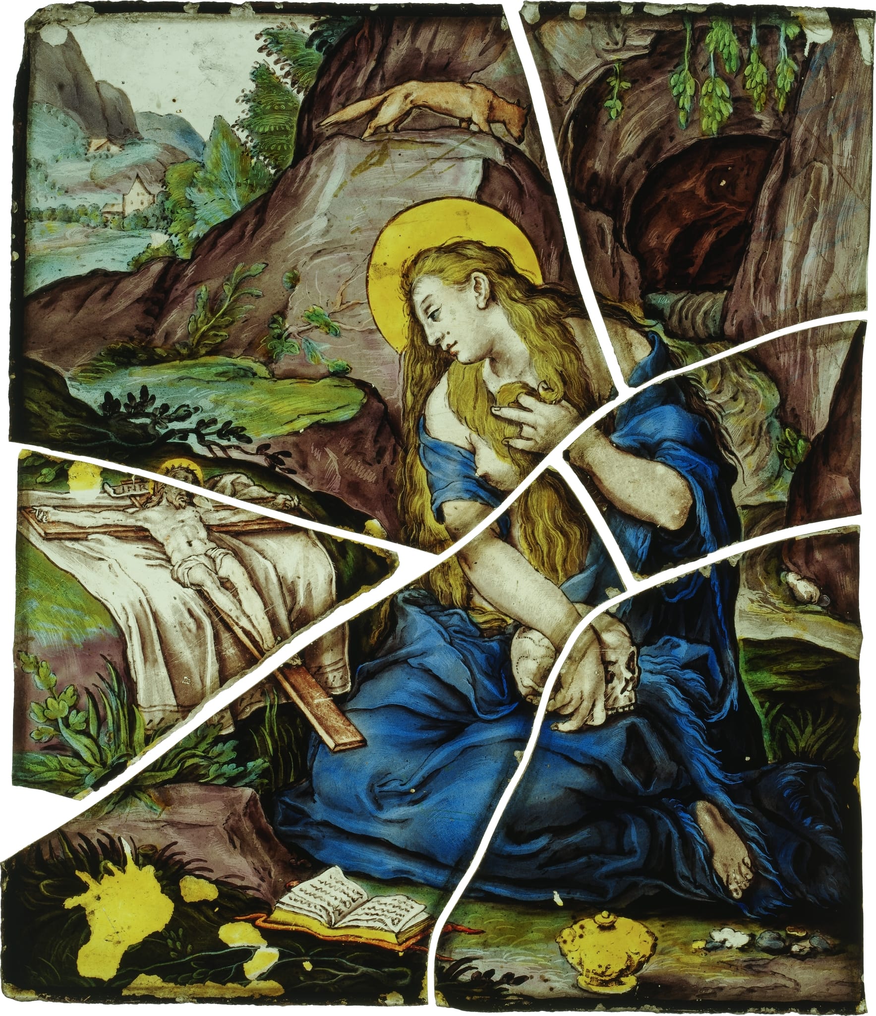 Vitrail rectangulaire brisé en six morceaux, représentant au premier plan sainte Marie Madeleine agenouillée en extase devant un crucifix et un livre ouvert, tenant de la main droite un crâne. Au second plan figurent des rochers, une grotte, une cascade, un renard et un paysage de montagne.