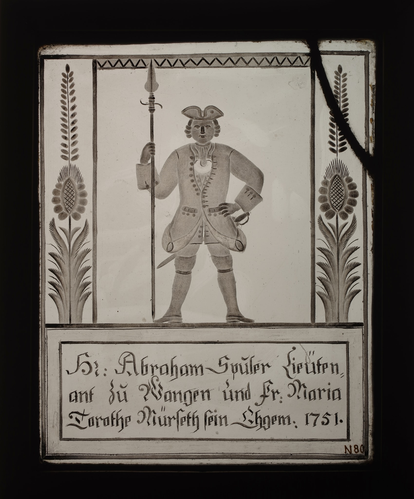 Vitrail aux noms d’Abraham Spuler (Spuhler) et Maria Dorothe Mürseth avec un soldat