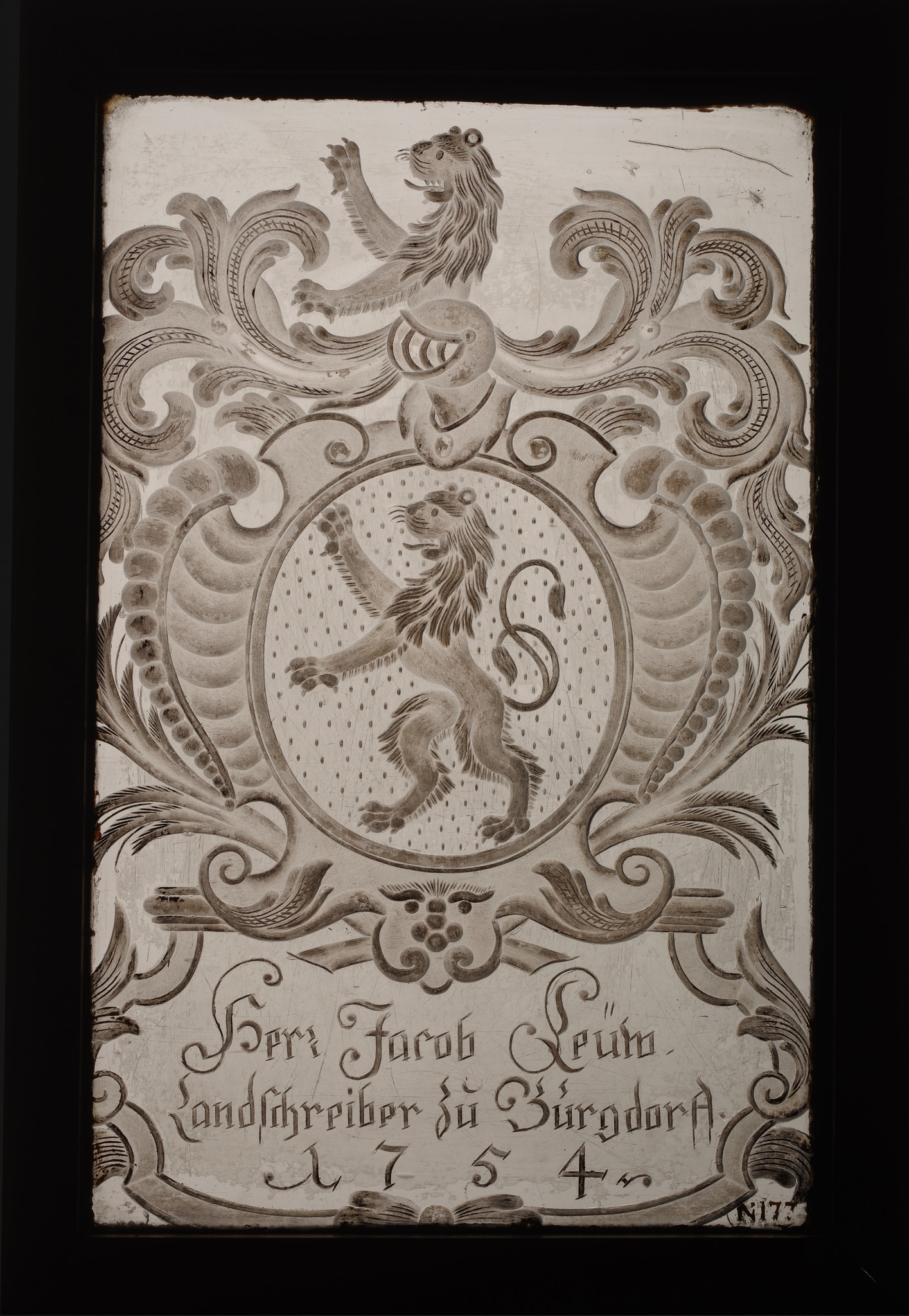 Le panneau a été donné en 1754 par Jacob Leuw (1719-1772), alors qu’il exerçait la fonction de “Landschreiber” (scribe) à Burgdorf (BE), activité attestée dès 1753. Il n’a épousé Katharina Stanz (1732-1795) qu’en 1757 à Jegenstorf, Fraubrunnen (BE) (HFLS), ce qui explique que son nom ne soit pas mentionné sur le vitrail. Les commanditaires de ce type de panneau sont originaires de divers milieux sociaux et professionnels. La coutume a dans un premier temps été introduite par les familles aisées, puis s’est étendue aux agriculteurs, artisans, négociants, enseignants, chirurgiens, etc. Les familles paysannes ne possédant souvent pas d’armoiries, elles se sont alors créé des armes évoquant leur fonction, soit de toute pièce, soit en lien avec leur nom, ce qui explique les nombreux écus armoriés qui ne correspondent pas toujours à ceux connus (Paravicini-Stähelin, 1926, p. XVII-XVIII).