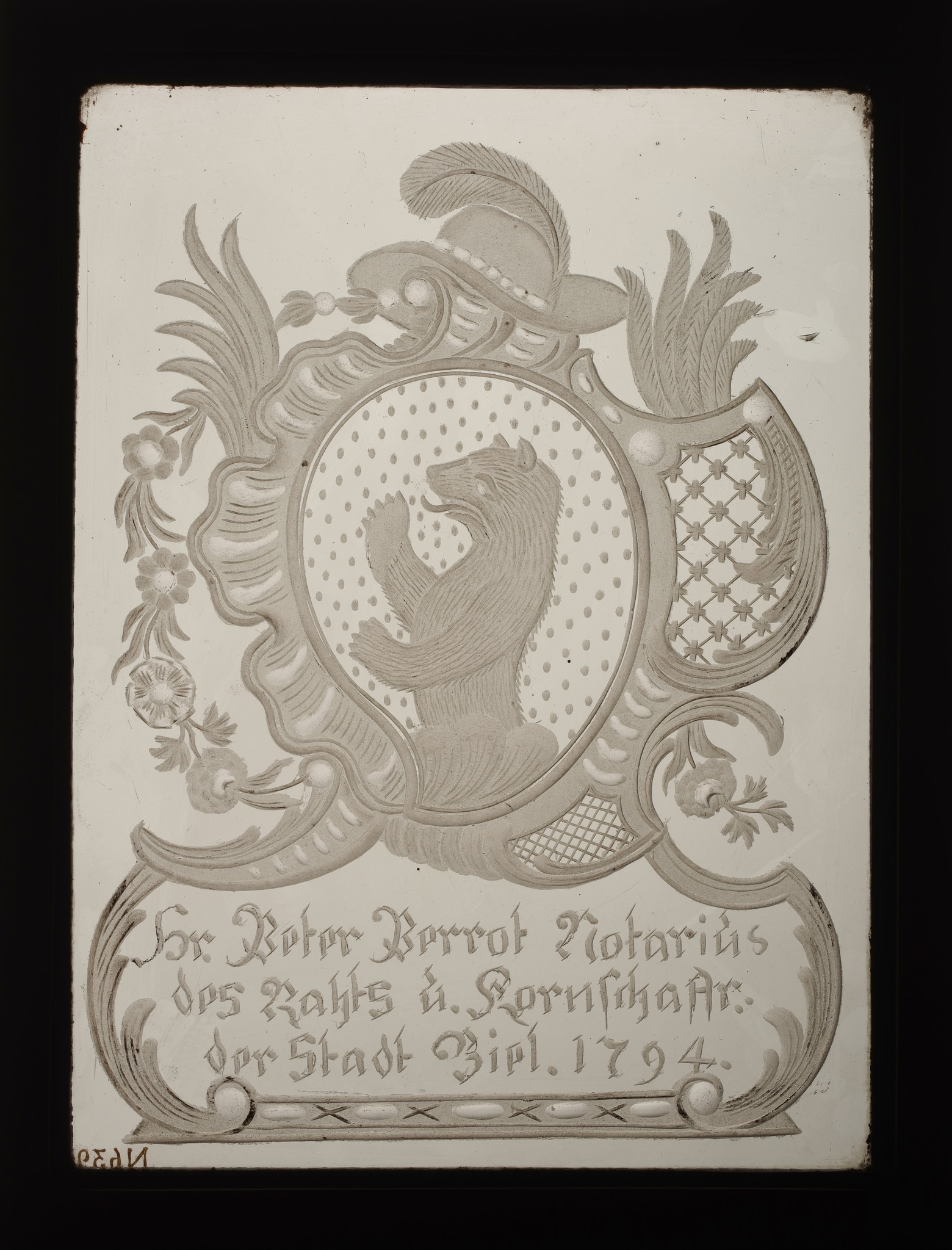 Hr. Peter Perrot Notariús / des Rahts ú. Kornschaffr: / der Stadt Biel. 1794. (en bas)