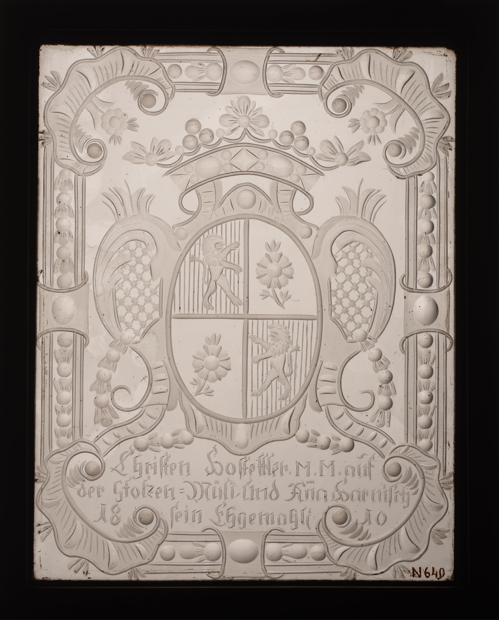 Vitrail monolithe rectangulaire gravé représentant au centre d’un cadre richement ornementé un écusson aux armes du donateur, encadré d’ornements et surmonté d’une couronne. Dans la partie inférieure figure une inscription des donateurs.