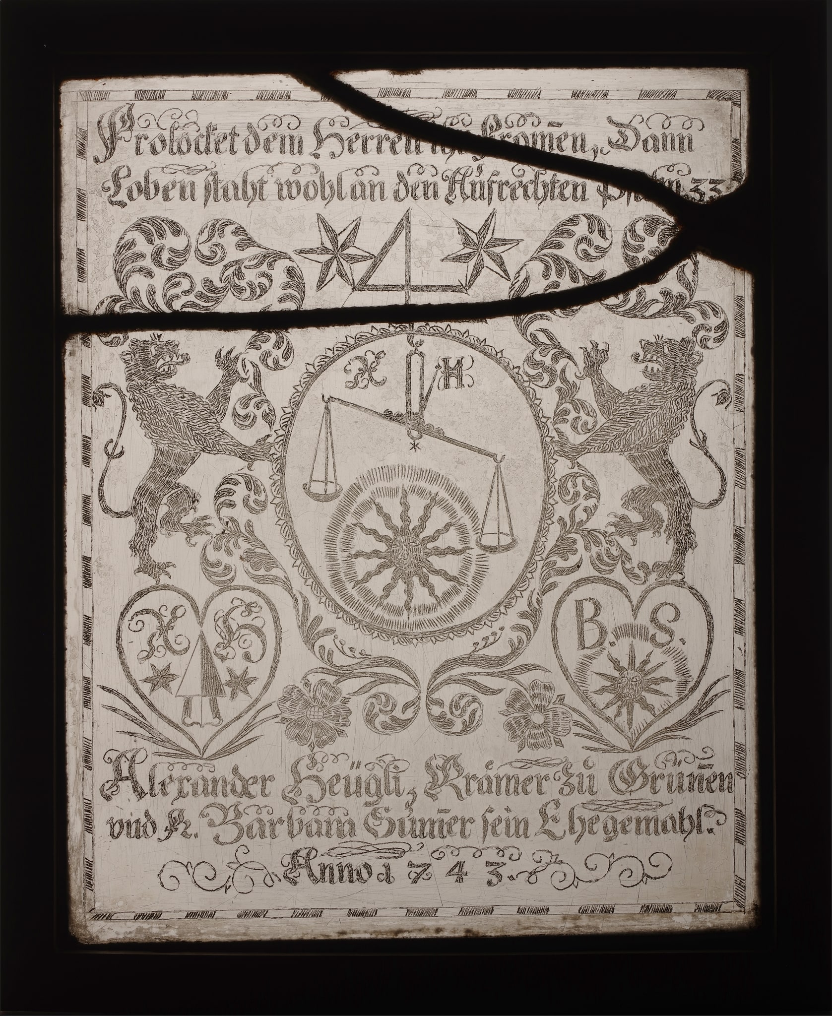 Dans le sillage de la prospérité économique que connaît la campagne bernoise et ses habitants au cours du XVIIIe siècle, cette nouvelle forme de vitrail venue de Bohème ou de Silésie se développe, attestant de la richesse de leur propriétaire (Paravicini-Stähelin, p. VIII). Ronds, ovales ou rectangulaires, ces panneaux gravés correspondent aux envies de lumière et de clarté dans les intérieurs du XVIIIe siècle. Ils sont élégamment et sobrement ornés d’inscriptions des donateurs, de citations bibliques, d’écus armoriés et d’ornements, parfois rehaussés à la grisaille (Rutsch, 1947, p. 5). Cet art populaire a décliné dès le XIXe siècle, dans un contexte de troubles politiques et d’essor croissant de l’industrie (Rutsch, 1947, p. 4).