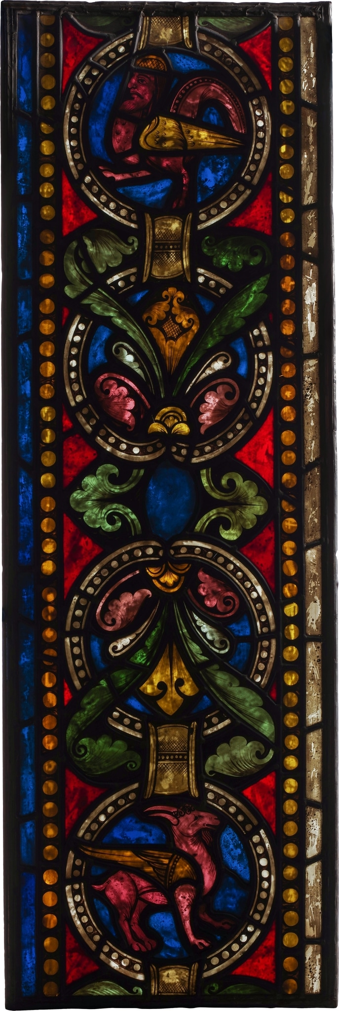 Ce fragment de bordure néogothique datant vers 1880 est l’oeuvre de l’atelier Champigneulle, Paris, dirigé par Louis-Charles-Marie, fils du verrier Charles-François Champigneulle. Ce verrier fait partie, comme de nombreux ateliers de peinture sur verre, des protagonistes ayant oeuvré au développement du vitrail néogothique. Il a notamment réalisé à la fin du XIXe siècle un vitrail-tableau à Paris pour la chapelle Sainte-Marie-de-la-famille (Callias Bey, 2009, p. 61).
