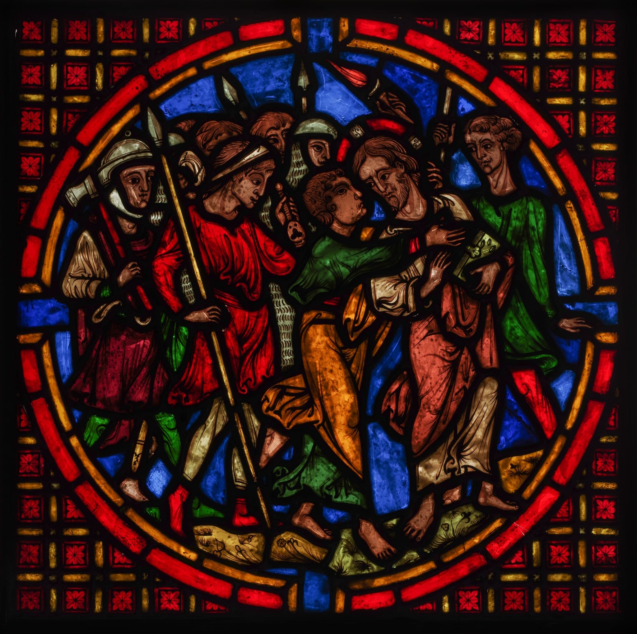 Pour cette scène du Baiser de Judas, Champigneulle s’inspire d’un médaillon datant du début du XIIIe siècle, consacré au même sujet, provenant de l’une des verrières consacrées à la Passion du Christ de la cathédrale Saint-Etienne de Bourges (Ribault, 1995, p. 175). L’atelier a refait à l’identique la composition des deux personnages centraux, Judas et le Christ, alors que les protagonistes qui les entourent ne sont pas des citations littérales, mais des inspirations directes des personnages secondaires issus de la scène de Bourges.