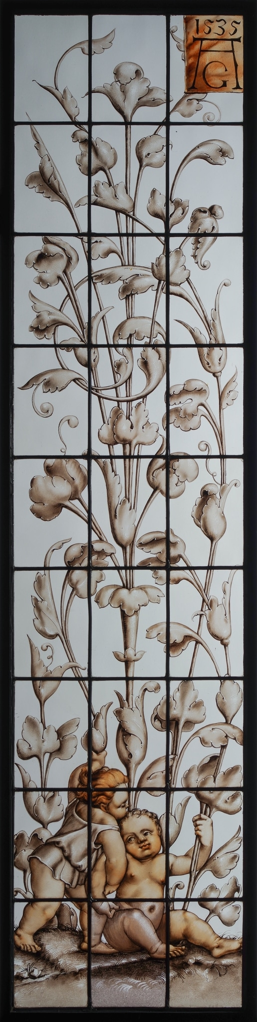 Champigneulle a fait une copie littérale de cette gravure datant de 1535 et signée du monogramme “AG” (en haut à droite), qu’il recopie à l’identique et place au même endroit, monogramme qui est d’ailleurs très proche graphiquement de celui d’Albrecht Dürer. La seule différence entre la gravure au burin et le vitrail réside dans l’arrière-plan qui est noir sur la gravure alors que Champigneulle décide logiquement de faire son dessin sur du verre incolore, permettant de mettre idéalement la composition en valeur et de laisser passer la lumière.