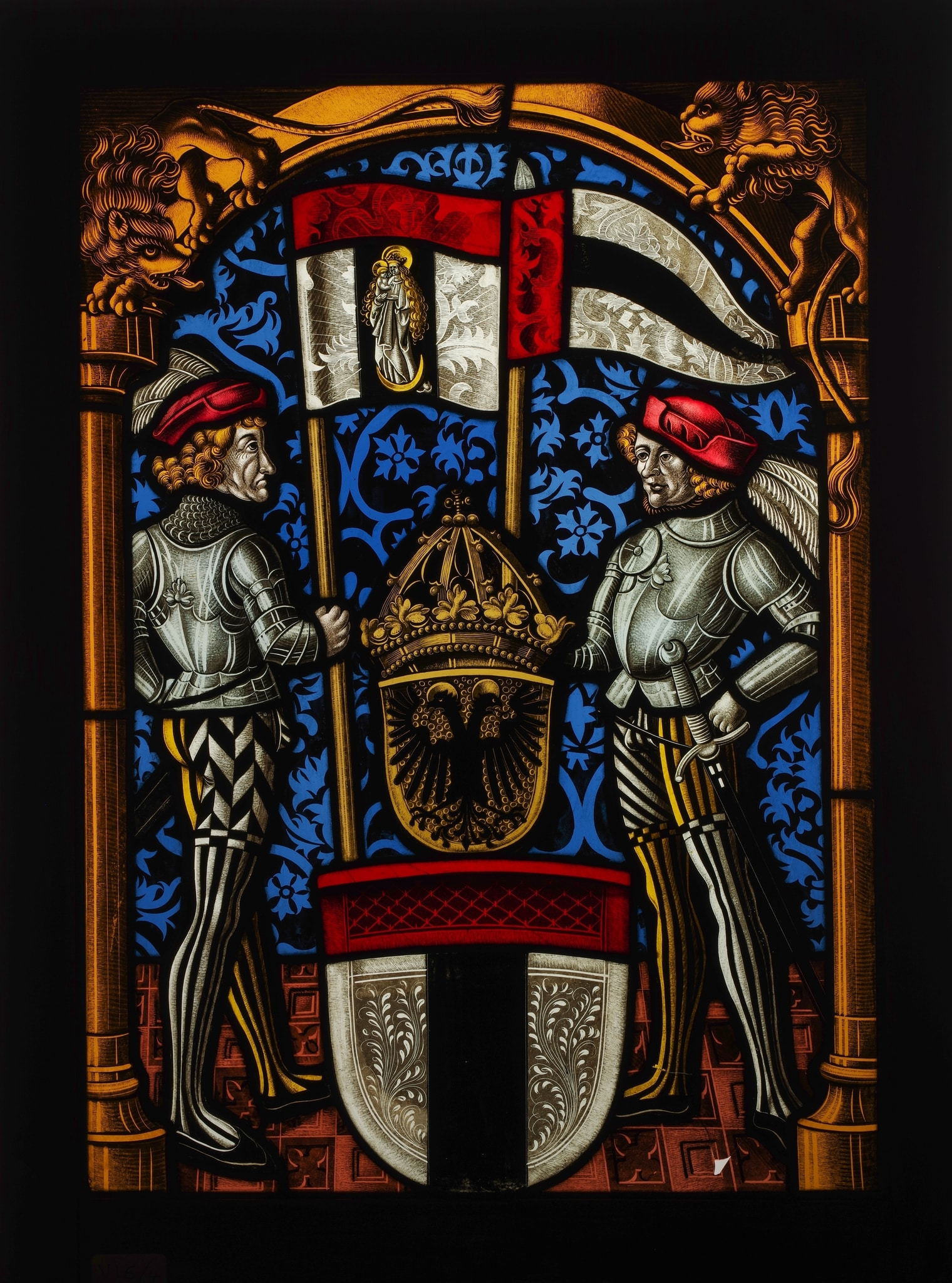 Sur un fond damassé bleu, les armoiries de la ville de Baden se dressent sur un carrelage rouge, surmontées de l'écu impérial couronné. De part et d’autres des armoiries, deux bannerets armés d'une épée apparaissent vêtus d'une demi-armure et sont coiffés d'un chapeau à plumes. Tous deux portent des bas rayés bicolores jaune et noir, ainsi que blanc et noir et tiennent chacun l’étendard de la ville, l’un accompagné au centre, sur la bande verticale noire, de la Vierge à l’Enfant sur un croissant de lune. L'encadrement est constitué de fines colonnes jaunes à chapiteaux doriques sur lesquels se tiennent des lions se regardant la gueule ouverte.