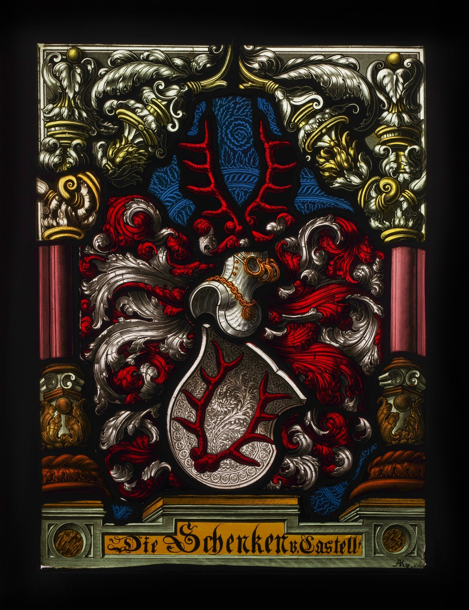 Ce vitrail aux armes de la famille Schenk von Castell, famille noble issue du canton de Thurgovie, a été réalisé par le verrier zurichois Adolf Kreuzer vers 1883. Il a été acheté par le Musée des arts décoratifs de Genève en 1898 auprès de l’antiquaire genevois Emile Dreyfuss avec deux autres vitraux (GE_2355)dont l’un conçu par le même verrier (GE_2357).