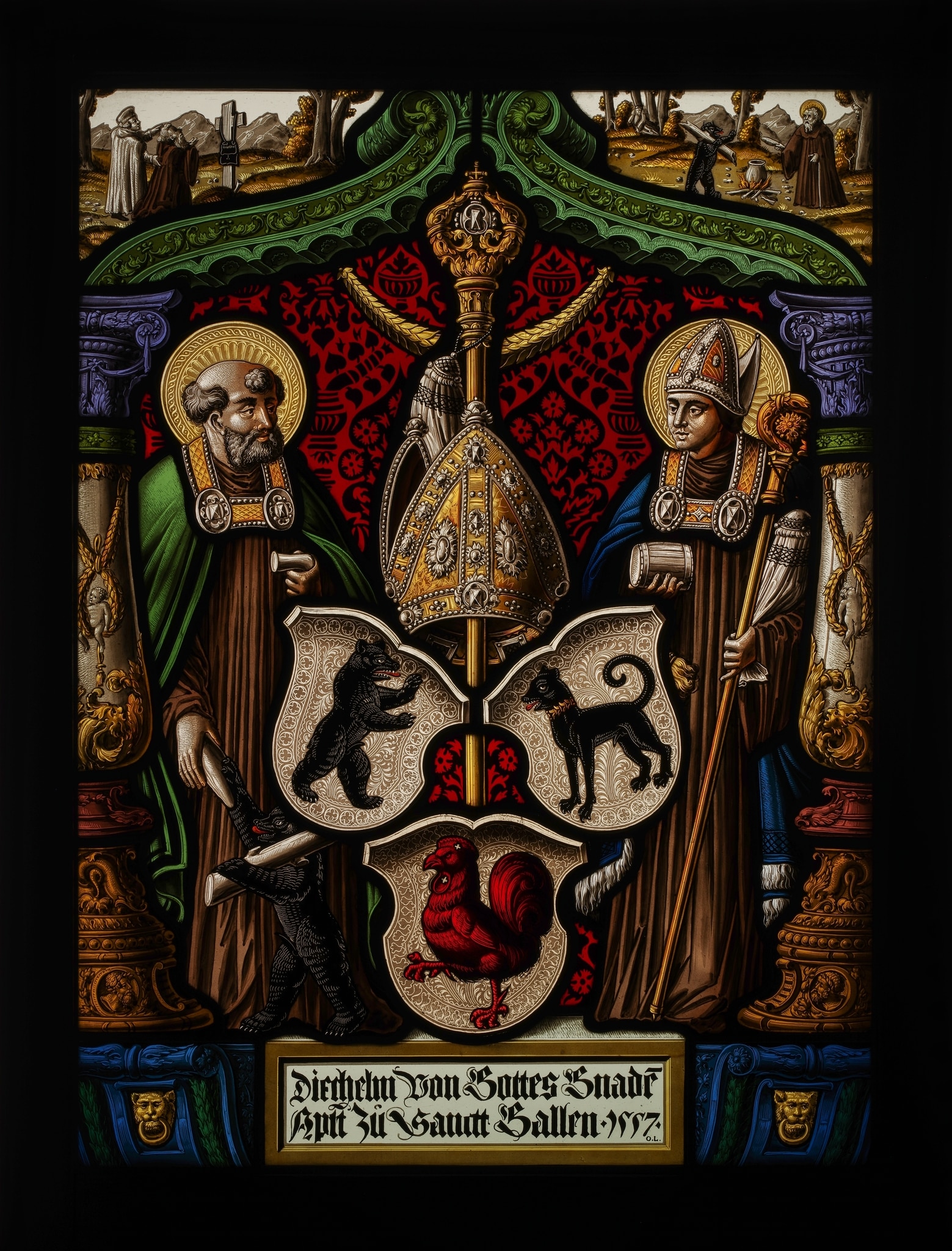 Sur un fond damassé rouge se dressent, disposées en pyramide, les armoiries de Diethelm Blarer von Wartensee surmontées de celles du monastère de Saint-Gall et du comté de Toggenbourg, couronnées d'une mitre et d'une crosse. Elles sont flanquées des patrons du monastère de Saint-Gall, les saints Gall et Othmar. Gall apparaît à gauche en compagnie d’un ours, qui se tient debout sur ses pattes arrières, portant une bûche. Saint Othmar, représenté en costume pontifical, coiffé d’une mitre, tient d'une main un tonneau de vin et de l’autre une crosse. L’encadrement architectural se compose de colonnes soutenant un arc en accolade dont les écoinçons illustrent des scènes de la vie de Gall. A gauche, il est agenouillé devant un crucifix et à droite un ours lui apporte du bois. Pour le remercier Gall lui tend du pain.