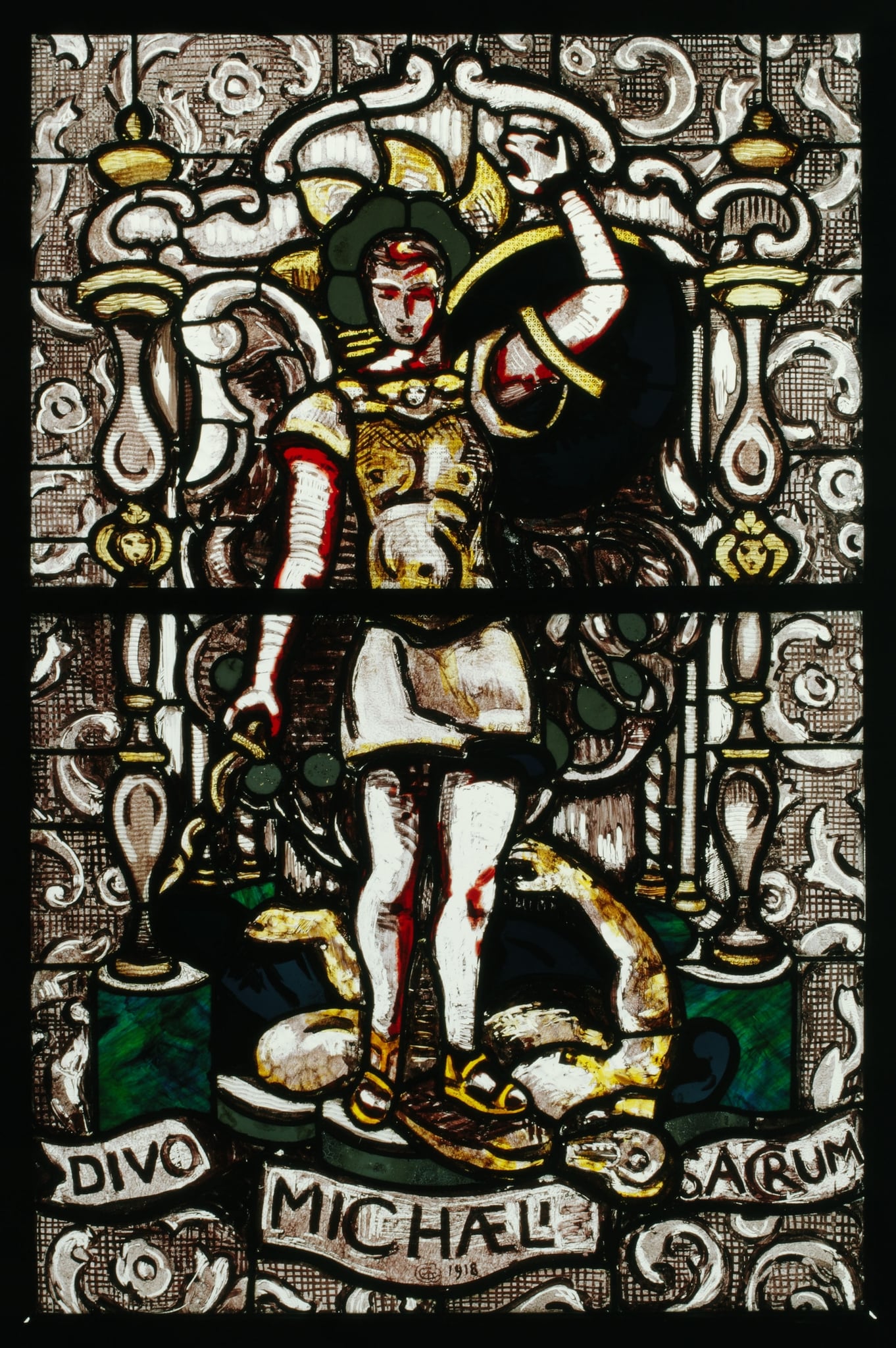 Cette verrière consacrée à l’archange Michel est une verrière de jeunesse du peintre verrier. Il n’a alors à son actif que ses vitraux des fenêtres hautes du choeur de Basilique Notre-Dame de Genève. Pourtant, elle révèle déjà des éléments essentiels du travail en devenir du peintre verrier genevois. La première est le choix des verres. Contrairement à la majeure partie des artistes, Cingria n’hésite à mélanger aux verres antiques des verres industriels divers. Il le relatera très bien en 1933 dans ses Souvenirs d’un peintre ambulant : “Contrairement à l’usage des peintres verriers, je ne craignais pas de mélanger tous ces verres de nature différente, ce qui permet d’obtenir dans le vitrail une préciosité de tons inconnue des anciens verriers” (Cingria, 1933, p. 122-123).