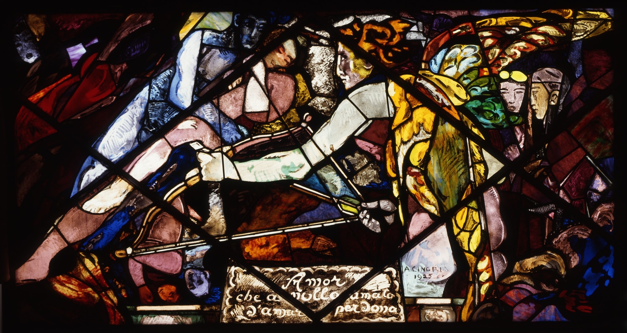 Ce vitrail illustre l’amour adultérin de Paolo et Francesca qui incarnent la passion amoureuse dans la Divine Comédie de Dante où ils sont les deux principales âmes condamnées à l’Enfer, dans le cercle de la luxure (chant V) dont un extrait figure au bas de la verrière (“Amor che a nullo amato d’amar perdona”, en français : ”Amour, qui à aimer contraint qui est aimé”; traduction complète du poème par A. Masseron dans Dante Alighieri, 1995). Ils font pendant au vitrail dédié par Cingria à Béatrice, qui incarne l’amour pur.