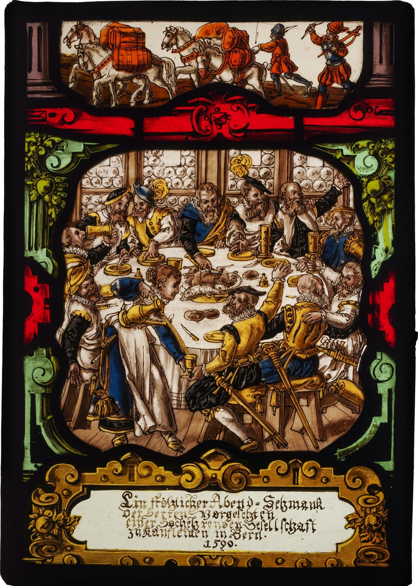 Le vitrail est subdivisé en trois registres. Au centre, sous un cadre architectural onze hommes, membres de la corporation des marchands bernois, sont réunis autour d’une grande table ronde, richement garnie. Ils boivent et discutent les uns avec les autres. Au premier plan, une servante vêtue d’un long tablier blanc, vient remplir le verre de l’un des convives alors que celui qui est assis derrière elle s’apprête à lui donner une tape sur les fesses. Des fenêtres à cives avec des vitraux décorent l’arrière-plan de la salle de la guilde. En haut, quatre chevaux de somme lourdement chargés (notamment de tonneaux) marchent, suivis par deux hommes qui les accompagnent tout en les fouettant pour les faire avancer. Peut-être est-ce une scène relatant le départ d’Égypte des frères de Joseph, avec leurs montures chargées de victuailles tiré de la Genèse 42.a. En bas, une inscription en allemand (traduction : un joyeux souper de messieurs les supérieurs d’une honorable société de marchands à Berne) suivie de la date “1590” est insérée dans un cartouche orné d’un large cadre décoratif composé de volutes et d’ornements floraux.