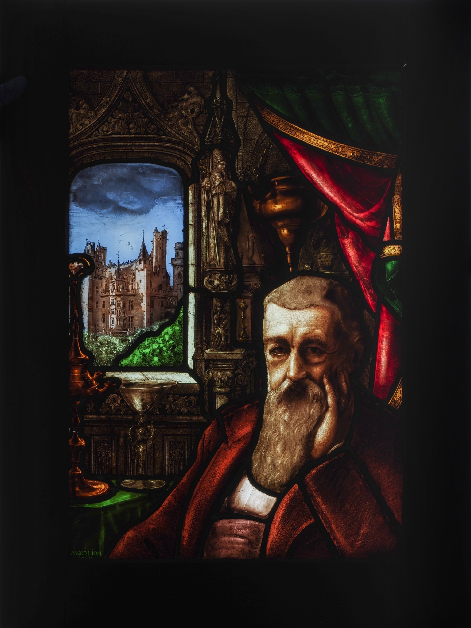 Un homme barbu, sa tête appuyée sur sa main gauche se présente en buste au premier plan d’un vitrail. Il apparaît dans un intérieur à l’arrière-plan duquel s’ouvre une fenêtre offrant une vue sur un château et de la verdure. La sculpture d’un saint coiffé d’une mitre et tenant une crosse et un livre debout sous un dais architectural s’érige dans l’encadrement de l’ouverture à droite. Différents objets ornent cet intérieur, parmi lesquels un calice et un pan de rideau rouge et vert, décoré d’une bordure dorée, soulevé et dévoilant une partie de cet intérieur.