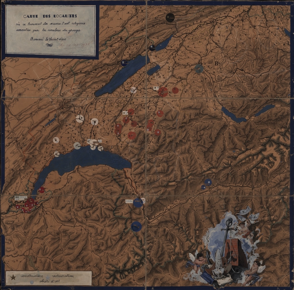 CARTE DES LOCALITES / où se trouvent des oeuvres d’art religieux / exécutées par les membres du groupe / Romand de Saint-Luc / An 24 XII 1932 (rectangle en haut à gauche)