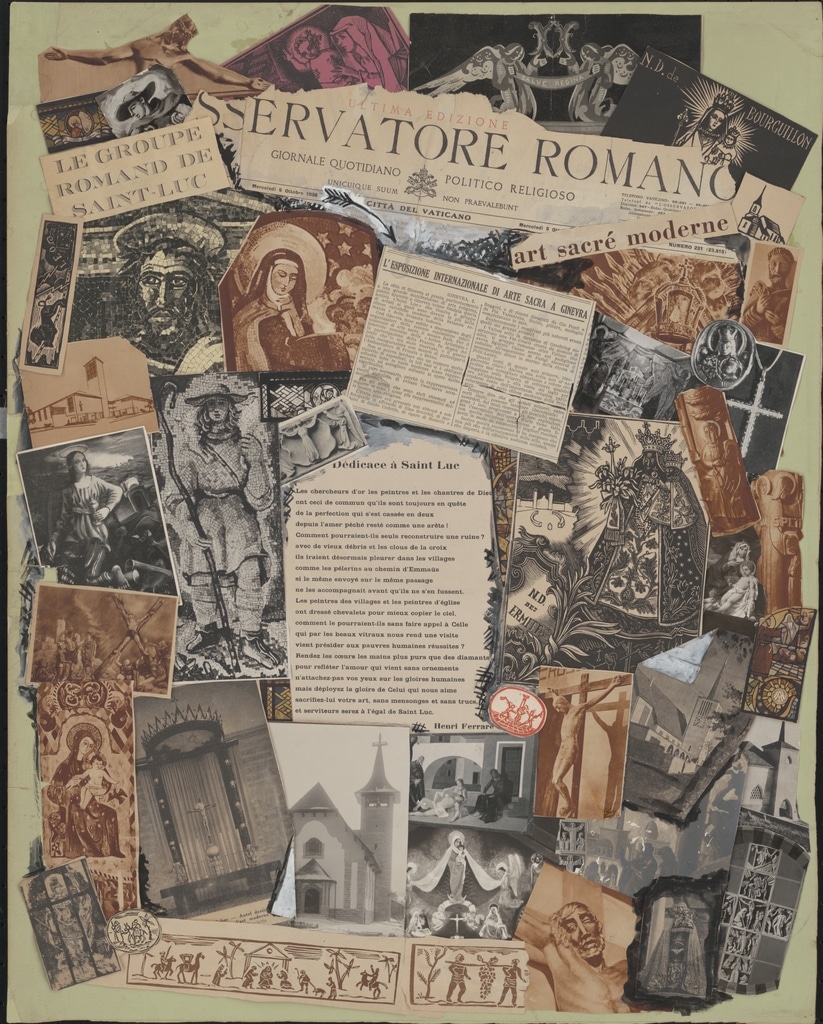 Ce collage a probablement été réalisé par Alexandre Cingria, dans la perspective d’une publication destinée aux membres du Groupe romand de Saint-Luc, dont il est le président et principal animateur. Au moment où ce collage est créé (probablement en 1938, comme l’indique la date de l’article de L’Osservatore romano qui y figure), cela fait quatre ans que le Groupe romand de Saint-Luc s’est constitué officiellement, se détachant de la partie alémanique de la Société Saint-Luc (SSL), qui se compose désormais de deux sections séparées placées sous son égide. Cette décision met fin à une période de huit ans durant laquelle romands et alémaniques auront oeuvré ensemble pour renouveler l’art religieux suisse, à la suite de leur association pour fonder la Société Saint-Luc en 1924 (Noverraz, 2022, p. 64-70).