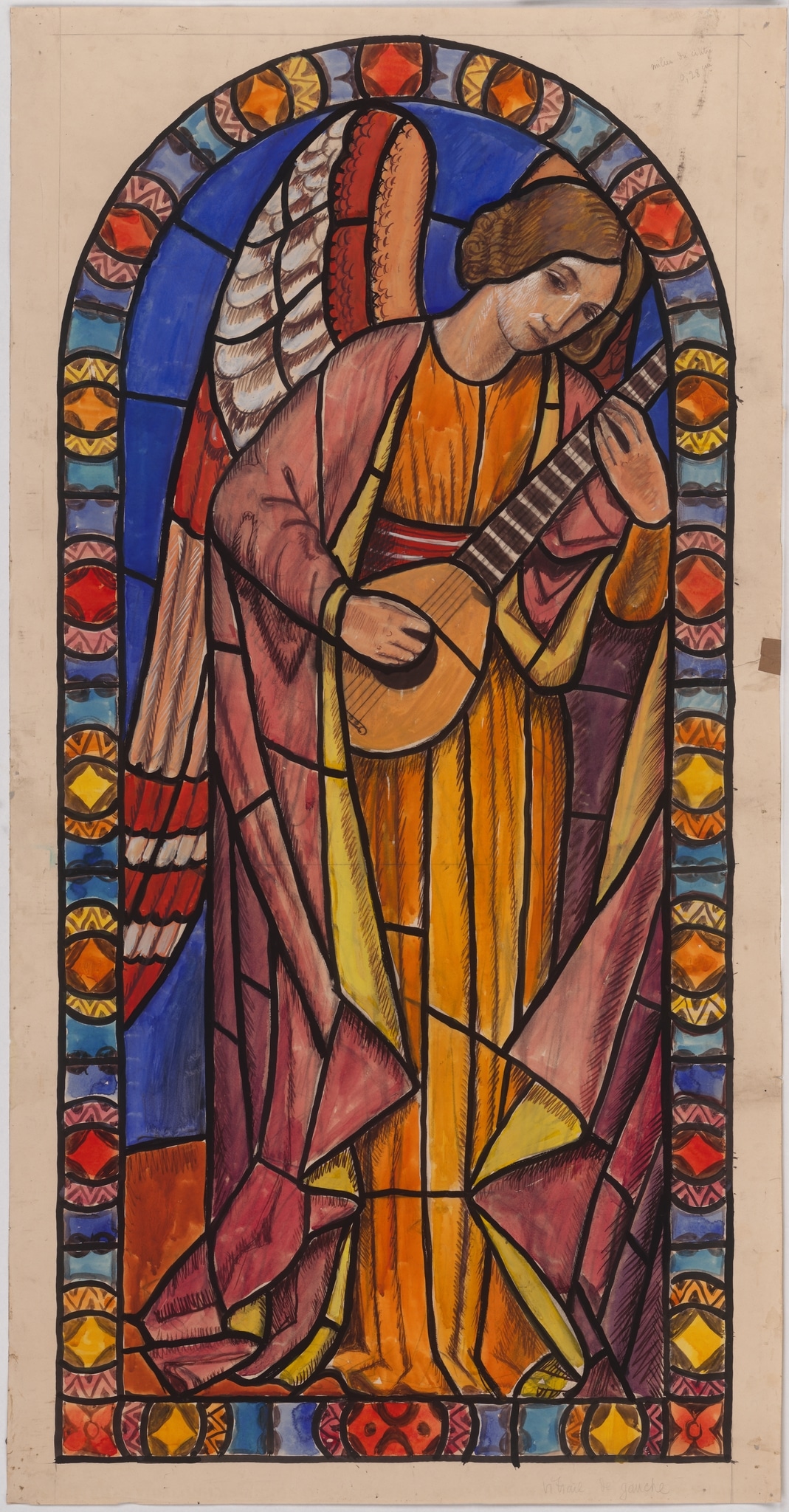 Ce carton pour un vitrail en plein cintre illustre un des deux anges musiciens accompagnant sainte Cécile figurée sur la verrière centrale.