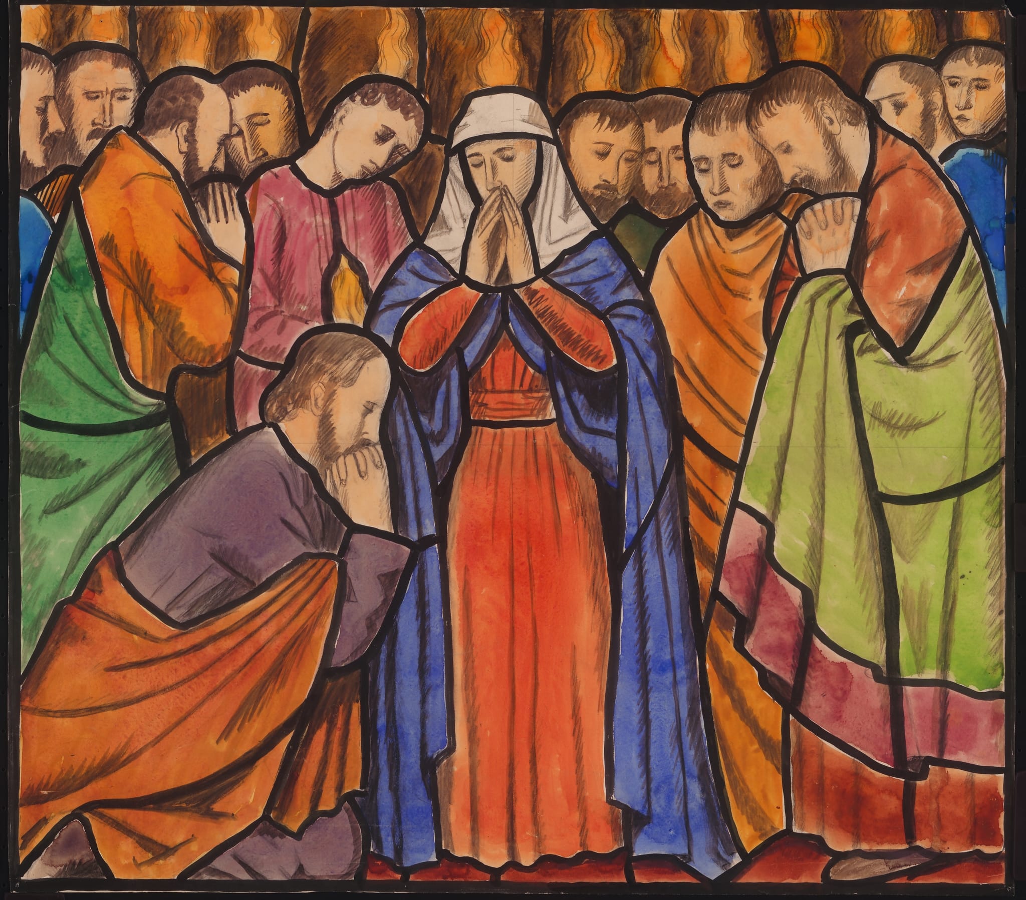 Ce carton pour le panneau central d’un vitrail mixte illustre la Pentecôte. La Vierge debout de face et voilée, porte une longue robe rouge sous un manteau bleu. Elle baisse les yeux et a les mains jointes. Les douze apôtres l’encadrent dont un de profil est agenouillé à sa droite alors qu’un second lui fait en face. Tous deux sont en prière. Ils reçoivent tous le don de l’Esprit Saint sous forme d’une langue de feu.