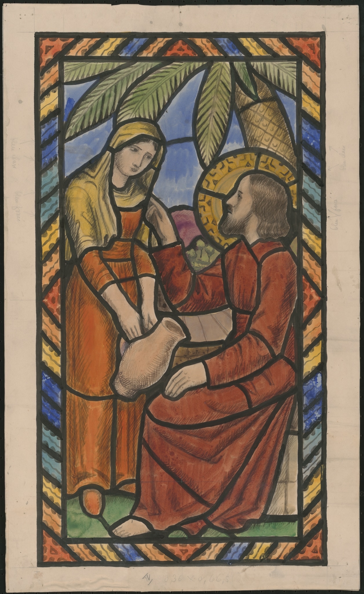 Ce carton illustre la rencontre du Christ et la Samaritaine. A droite, le Christ nimbé, vêtu d’une longue robe rouge, est assis sur la bord d’un puits et s’adresse à une femme (la Samaritaine) debout devant lui, voilée de jaune et vêtue d’une robe orangée, tenant une cruche de ses deux mains. S’érige derrière eux un palmier et a l’arrière-plan un paysage arboré.