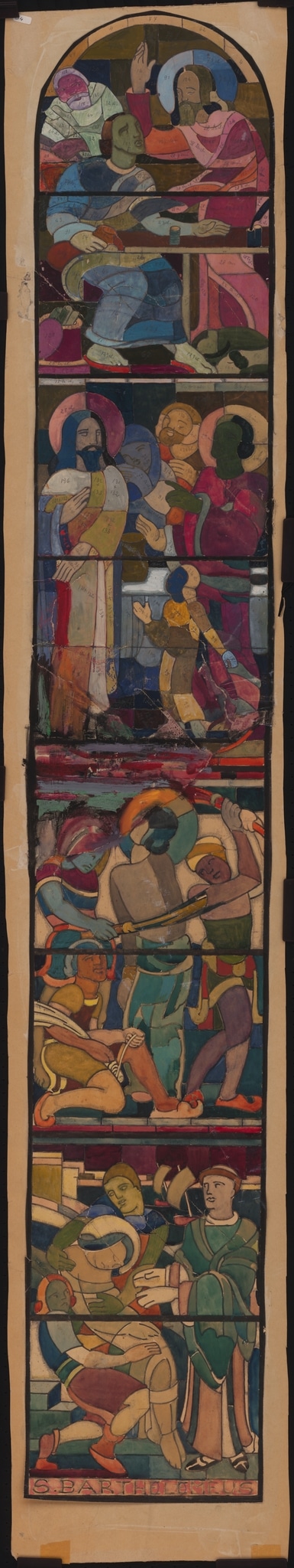 Cette oeuvre graphique combine deux parties de maquettes pour deux des vitraux de la nef de l’église Saint-Pierre de Fribourg, l’un consacré à saint Matthieu et l’autre à saint Barthélémy. Les seize vitraux de la nef sont l’oeuvre de l’artiste Jean-Edouard de Castella et de l’atelier fribourgeois A. Kirsch & Cie.