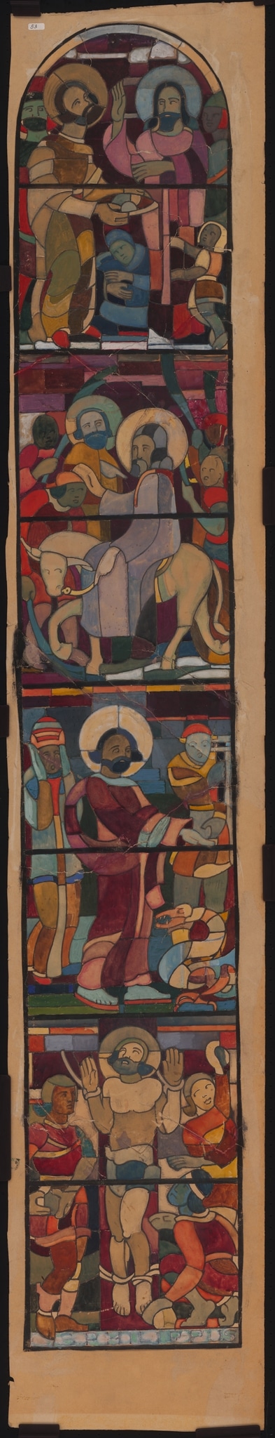 Cette maquette est le projet pour l’ensemble des quatre scènes du cinquième vitrail de gauche de la nef de l’église Saint-Pierre de Fribourg, consacré à saint Philippe. Les seize vitraux de la nef sont l’oeuvre de l’artiste fribourgeois Jean-Edouard de Castella et de l’atelier fribourgeois A. Kirsch & Cie.