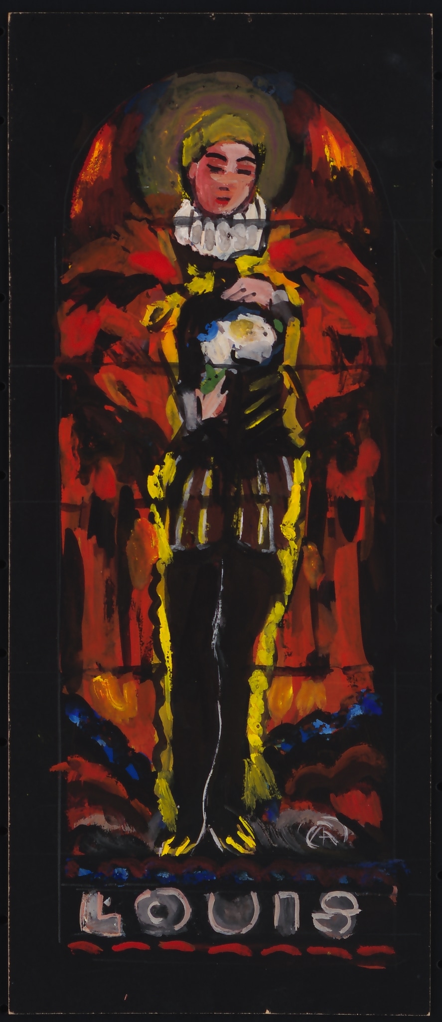 Pour le vitrail de Louis de Gonzague, il n’existe pas de carton, mais la comparaison de cette maquette avec le vitrail révèle les différents changements opérés. Cingria a défini les lignes principales de son dessin, la position générale de la figure et les coloris principaux mais il a tout de même procédé à quelques modifications, comme la position de la tête et du corps du saint, tournés désormais vers la gauche plutôt que vers la droite. Le manteau rouge couvrant jusqu’aux pieds le saint est déjà presque définitif sur la maquette, à l’exception de la teinte grise qu’il a remplacée par du bleu pour offrir plus de vivacité à son dessin. Il apparaît donc très vraisemblable que Cingria ait également réalisé un carton pour cette figure sur lequel il aura reporté au moins une partie de ces modifications.