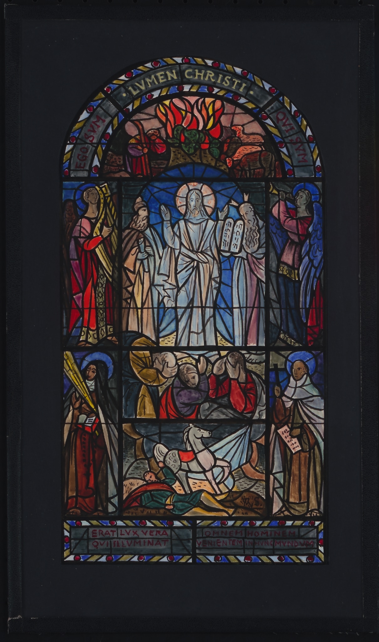 La comparaison de cette maquette avec le vitrail nous révèle quelques changements mineurs, certainement décidés avec l’abbé Borcard qui avait élaboré le programme iconographique. Les anges musiciens qui encadrent la scène ne sont plus accompagnés d’instruments de musique sur le vitrail mais portent flambeau et encensoir, alors que l’inscription sur la bordure du bas a changé et est devenue plus courte.