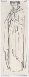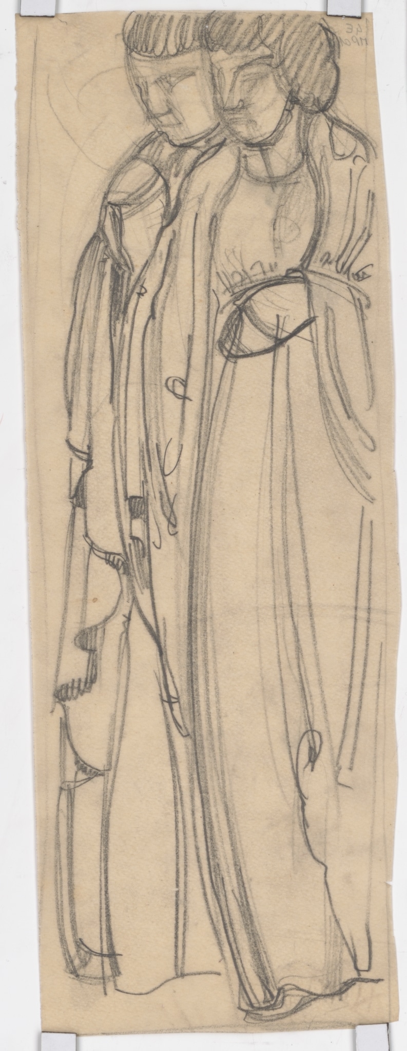 L'artiste réalise une première esquisse de ces personnages, les montrant côte à côte et insérés dans le cadre architectural définitif (MP_01.05). Il modifie ensuite leur position pour les placer l'un derrière l'autre, celui de gauche en prière. Une fois ces éléments principaux fixés, il s’intéresse à l’équilibre des contrastes et aux jeux d'ombre et de lumière sur un dessin travaillé au crayon de manière très minutieuse (MP_01.10), présentant des hachures qui évoquent le futur travail de la grisaille, dans une démarche qui est autant celle du peintre que du verrier.