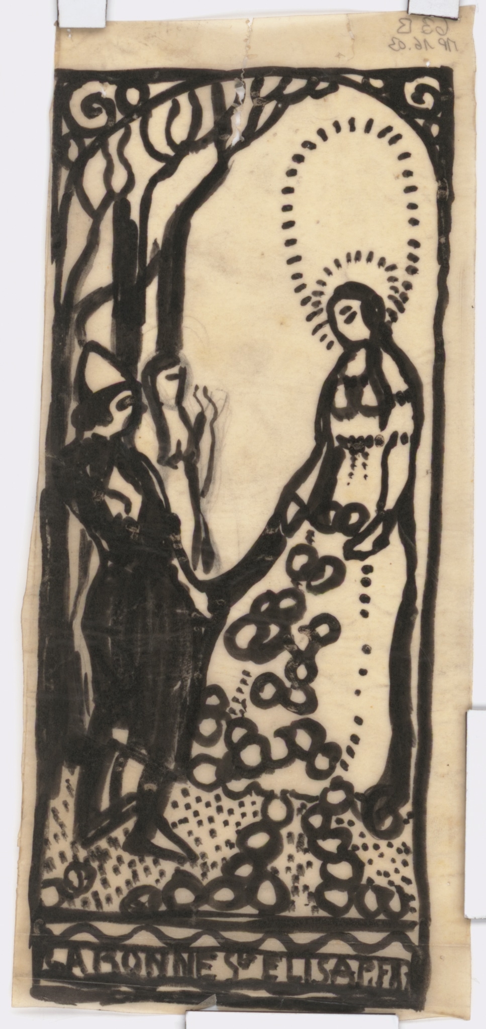 Cette esquisse est un travail préparatoire pour un vitrail consacré à sainte Élisabeth de Hongrie, réalisé en 1915 par l’artiste genevois Marcel Poncet (GSL_561). Il a été posé en 1941 dans la salle paroissiale attenante à la chapelle catholique d’Aubonne, où il se trouve encore actuellement. Ce vitrail se trouvait à l’origine dans la maison Maurer, espace utilisé comme lieu de culte par la communauté catholique d’Aubonne, avant d’être déplacé à son emplacement actuel lors la construction de la chapelle en 1939-1941 par les architectes François de Reynold et Albert Cingria (Lincio, 2002, p. 18).