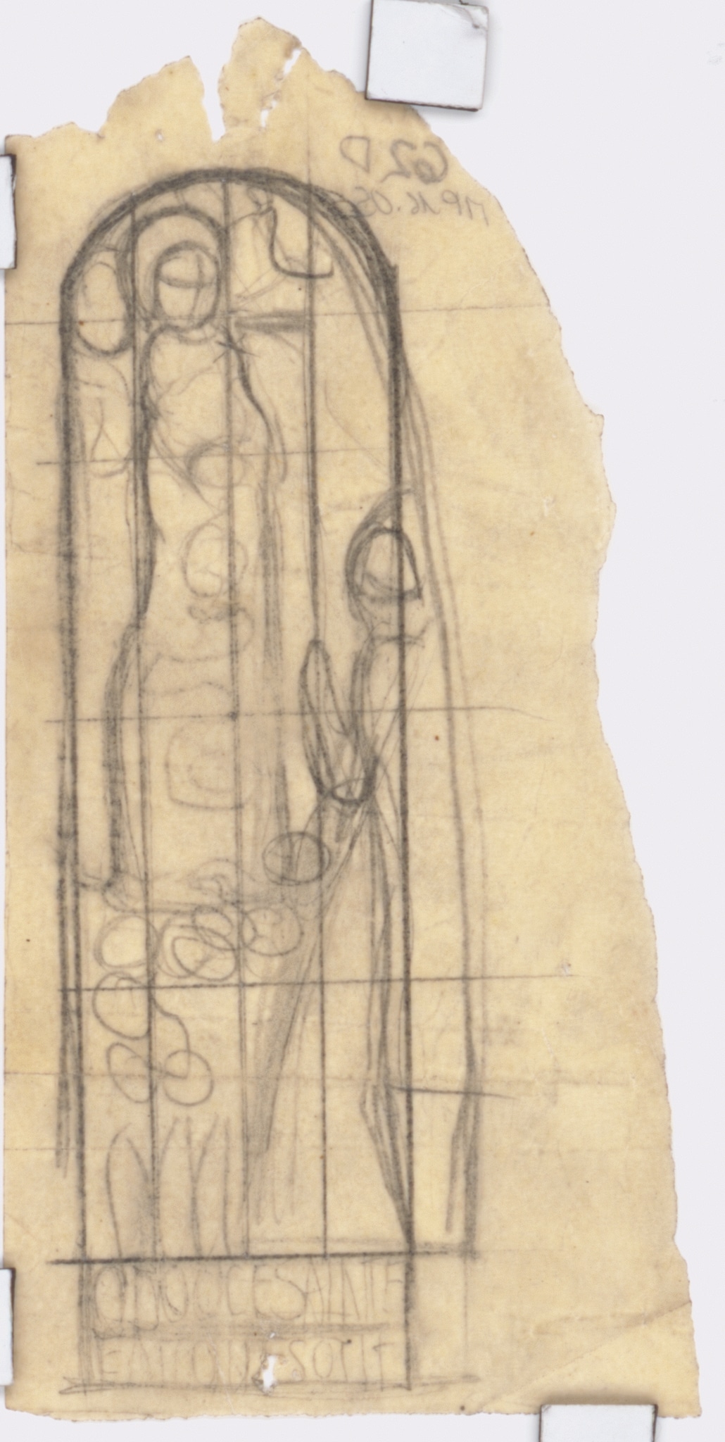 Cette esquisse est un travail préparatoire pour un vitrail consacré à sainte Élisabeth de Hongrie, réalisé en 1915 par l’artiste genevois Marcel Poncet (GSL_561). Il a été posé en 1941 dans la salle paroissiale attenante à la chapelle catholique d’Aubonne, où il se trouve encore actuellement. Ce vitrail se trouvait à l’origine dans la maison Maurer, espace utilisé comme lieu de culte par la communauté catholique d’Aubonne, avant d’être déplacé à son emplacement actuel lors la construction de la chapelle en 1939-1941 par les architectes François de Reynold et Albert Cingria (Lincio, 2002, p. 18).