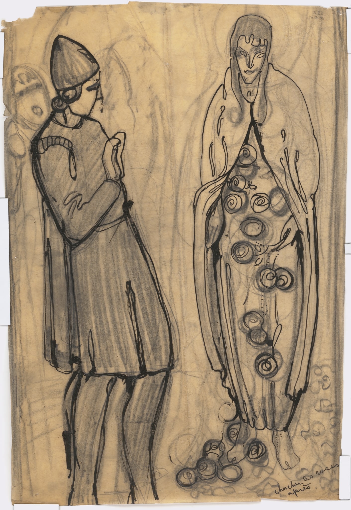 Dans le fonds de l’artiste déposé au Vitrocentre Romont, sont conservées huit oeuvres préparatoires en lien avec ce vitrail, dont cette esquisse fait partie. Elles illustrent le processus de réflexion de l’artiste qui imagine plusieurs options pour la composition de cette scène. Sur les premières esquisses (MP_16.01 ; MP_16.02 ; MP_16.03), la sainte est représentée à droite et son mari, le roi Louis de Thuringe, à gauche, en cotte courte, déjà coiffé du casque de chevalier qu’il porte sur le vitrail mais sans la maille métallique qui figure sur l’oeuvre verrière. Sur deux d’entre elles, dont celle-ci (MP_16.01 et MP_16.03), il envisage déjà la présence d’un troisième personnage, une suivante assistant à la scène, et imagine des perles pour l’auréole de sainte Élisabeth (MP_16.02 ; MP_16.03), parti qui sera abandonné dans les étapes suivantes.