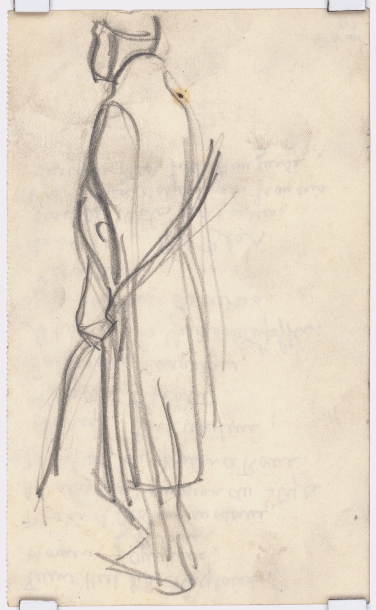 Dans le fonds de l’artiste déposé au Vitrocentre Romont, sont conservées huit oeuvres préparatoires en lien avec ce vitrail, dont cette esquisse fait partie. Elles illustrent le processus de réflexion de l’artiste qui imagine plusieurs options pour la composition de cette scène. Sur les premières esquisses (MP_16.01 ; MP_16.02 ; MP_16.03), la sainte est représentée à droite et son mari, le roi Louis de Thuringe, à gauche, en cotte courte, déjà coiffé du casque de chevalier qu’il porte sur le vitrail mais sans la maille métallique qui figure sur l’oeuvre verrière. Sur deux d’entre elles (MP_16.01 et MP_16.03), il envisage déjà la présence d’un troisième personnage, une suivante assistant à la scène, et imagine des perles pour l’auréole de sainte Élisabeth (MP_16.02 ; MP_16.03), parti qui sera abandonné dans les étapes suivantes.