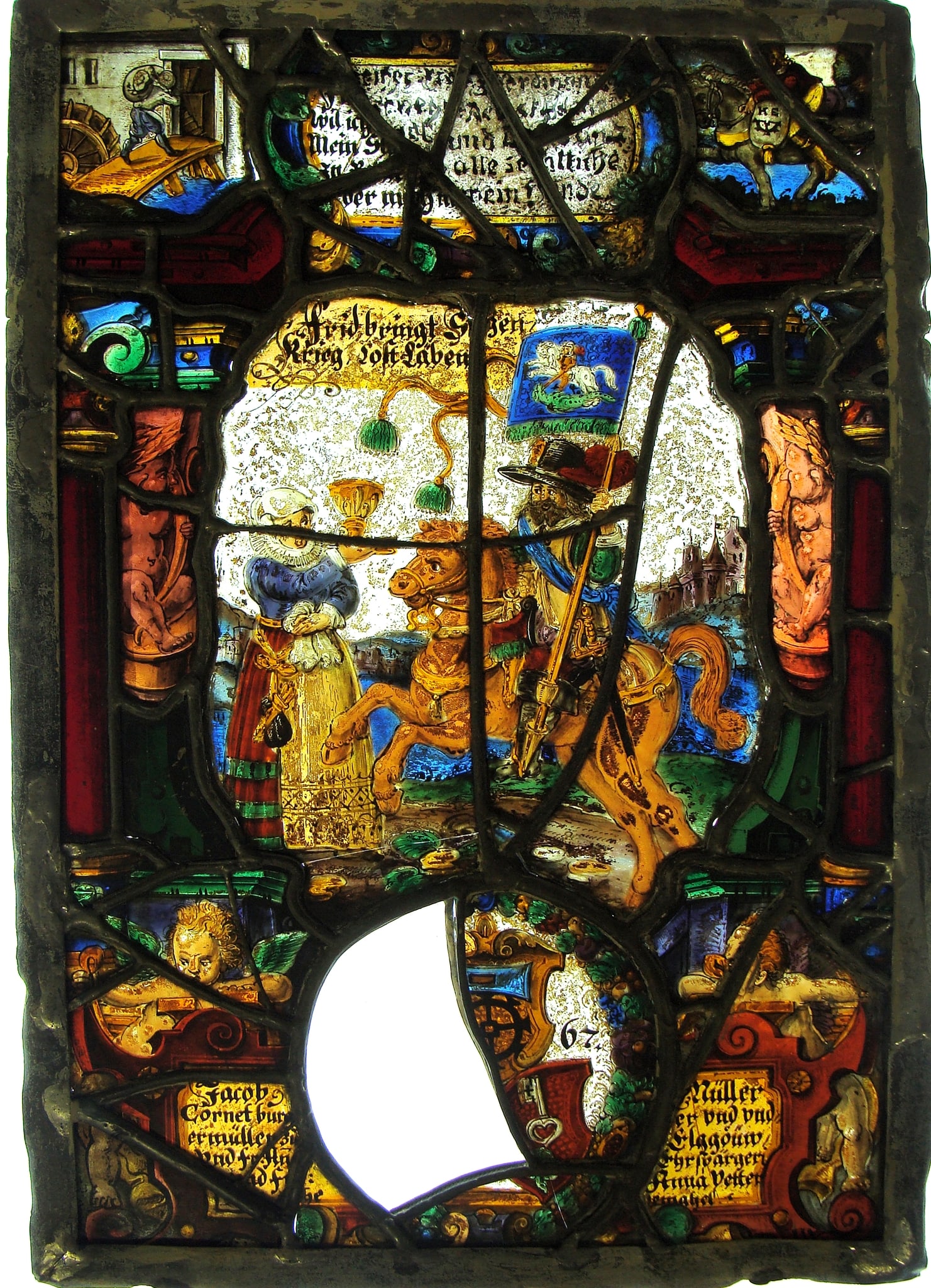 An architectural frame of red columns, green capitals, and pink caryatids on green bases encloses the central scene. An inscription plate appears above. In the upper left-hand corner, a miller carries grain to a mill. On the right, a miller rides on horseback with a bag of grain or flour across the saddle. The central scene shows a woman on the left who holds an elaborate stemmed cup in her upraised right arm. On her right, a rider on a prancing horse holds a banner. In the green background is a blue lake, while in the distance there is a town in purple. Below; two putti flank an elaborate inscription cartouche at whose center is a coat of arms surrounded by a wreath.