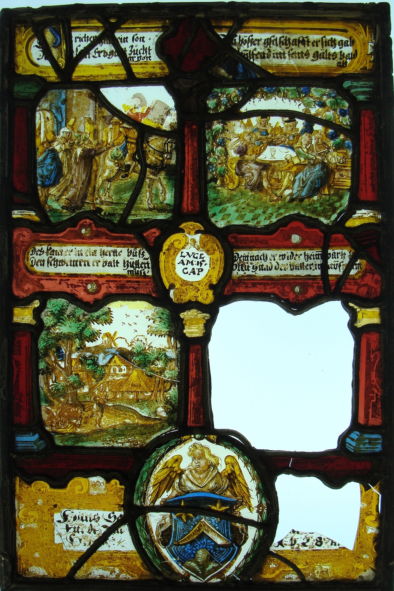 The panel is divided into four narrative scenes in two registers by red columns with yellow capitals and blue bases. In the center a cartouche cites the Gospel: Luke 15. Descriptive text panels are above each scene. At the top, on the left, the prodigal son takes leave of his father and on the right, he squanders his inheritance on prostitutes. Below on the left, he tends swine. The lost panel on the right would have shown the prodigal’s return to his father who welcomes him with joy. Below the scenes, in the center of the dedication panel, an olive wreath encloses a coat of arms held by an angel.