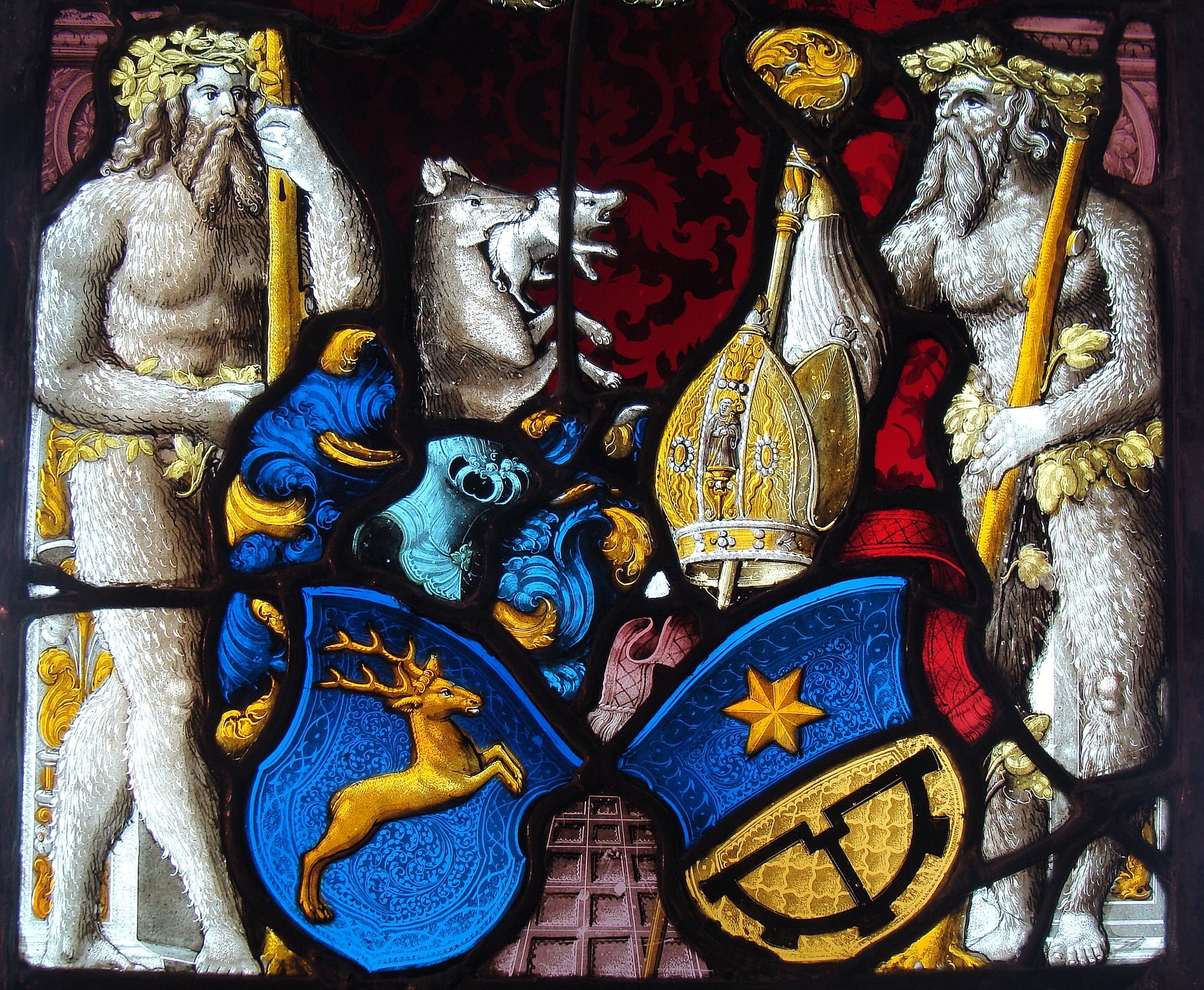 Wildmen were popular motifs in late-medieval and Renaissance art, depicted sporadically as a heraldic device but far more commonly as supporters. One of the first examples may possibly be the seal of Bergen op Zoom of 1374 with three supporters, but the tradition became common by the end of the fifteenth century (Bernheimer, 1979, pp. 179–180). The wildman symbol has multiple complex associations, stressing both the wildman's supernatural strength and his awareness of nature and its primeval truths (Husband, 1980); White, 1972, pp. 3–30). In the case of the Abbey of St. Blasien, a confluence of meanings can be posited. The monastery’s location in the Black Forest and the monastic model of rejecting society in favor of solitude in the wilderness resonates with the habitat and behavior of the wildman. These wildmen are well behaved, and wear leafy vines over their loins. Their dignity suggests a connection to the renewed interest in hirsute saints around 1500 in Germany. Depictions of the John Chrysostom, crawling naked on his knees as penance, and St. Onuphrius living off figs and clothed only in thick body hair appear in works of Hans Schäufelein, Albrecht Dürer, Lucas Cranach, and Hans Sebald Beham (Husband, 1980, pp. 95–99 and 107–109.) In addition, Onuphrius, who, during his early years, was nourished miraculously by a white deer and fed bread by a raven seems to reinforce the connection between the inherently virtuous forest creatures and the ability of human wildmen to serve a higher spiritual order (Herder Lexikon, 1968–76, vol. 8, pp. 83–88; Réau, 1955–59, vol. 3:2, pp. 1007–1010). Accordingly, their role lends itself to the patron saint Blaise, who demonstrated miraculous healing powers to the forest animals who recognized his virtues.
