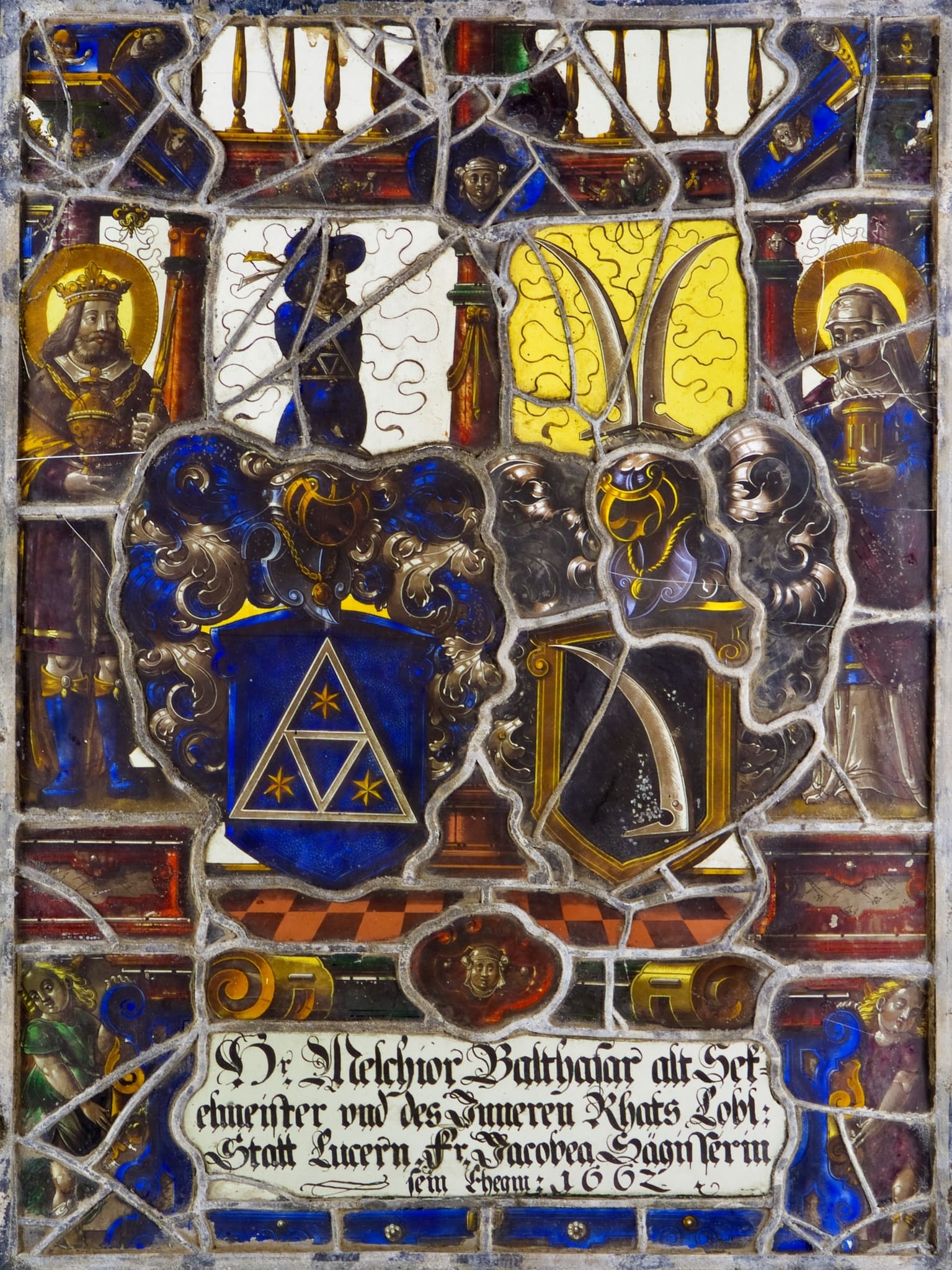 Between 1662 and 1669, a series of panels was apparently created for the Lucerne Rathaus by Jakob Geilinger the Elder (1611–1677), a prominent painter in mid-seventeenth century Lucerne (Lehmann, 1941, pp. 200–210, figs. 285, 286; Habegger, 2001, pp. 103–106). Despite the repeated format, they are lively and varied. The donors are honored by the display of lineage, and at the same time invoke piety through the presence of patron saints. The inscription names the man as a member of the Inneren Rhats (Inner Council) of the Praiseworthy City of Lucerne and a number of the families appear to be interrelated. Melchior Balthasar (1596–1661) was a merchant in transportation, wholesaling, and the official wine trade. His first marriage was to Anna Maria von Castanea with whom he had seven children. In 1647 he married Maria Jakobea III Segesser von Baldegg, then aged fifty. He apparently was a patron of a country church St. Jost in Blatten, Malters, five kilometers west of Lucerne, which he also embellished with a heraldic shield.